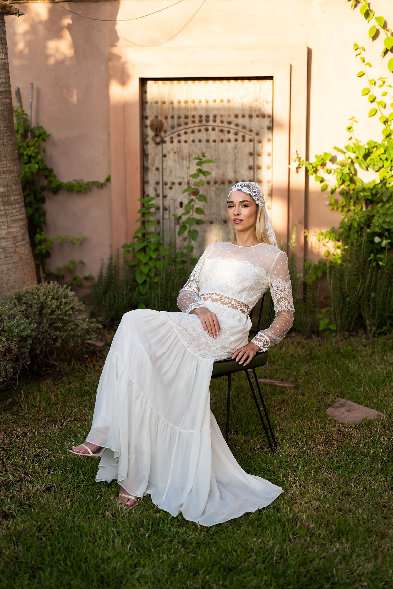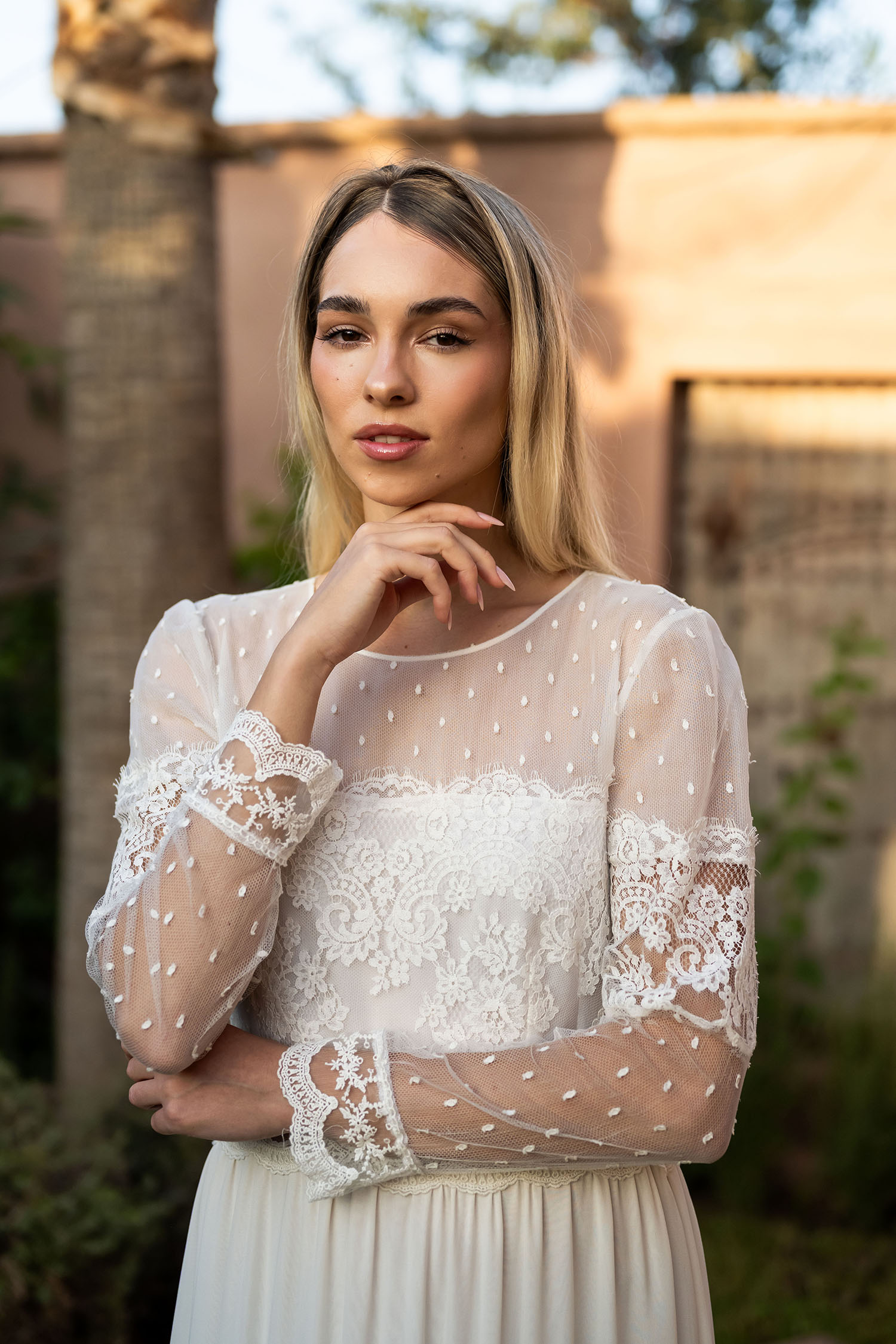 Tribute to the 70s, this dress is endowed with magnificent details and mixes of laces that make it feminine and unpublished. It has a rounded neckline that emphasizes the wearing of the head. Its cut of size highlights the bust and its wide lace leaves a glimpse of the skin. The openwork back of lace and tulle satin is embellished with a multitude of covered buttons. Light, the skirt with large ruffles dances and flies according to the movements.