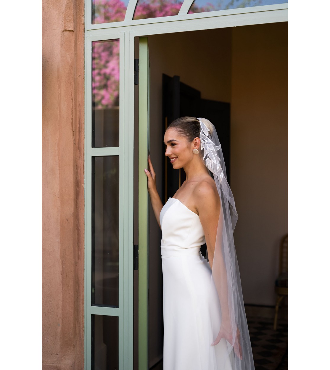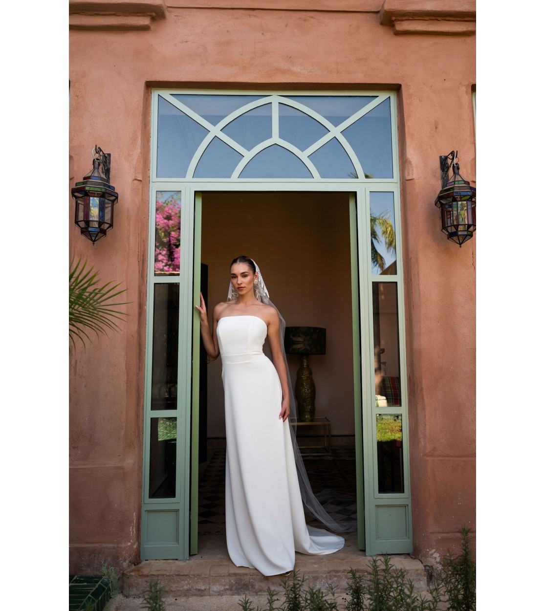 With its sculptural elegance, the silhouette enchants through its curved strapless neckline and full skirt that extends into a delicately designed train.