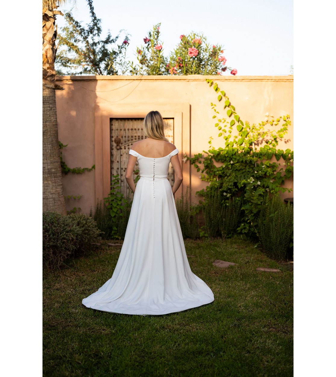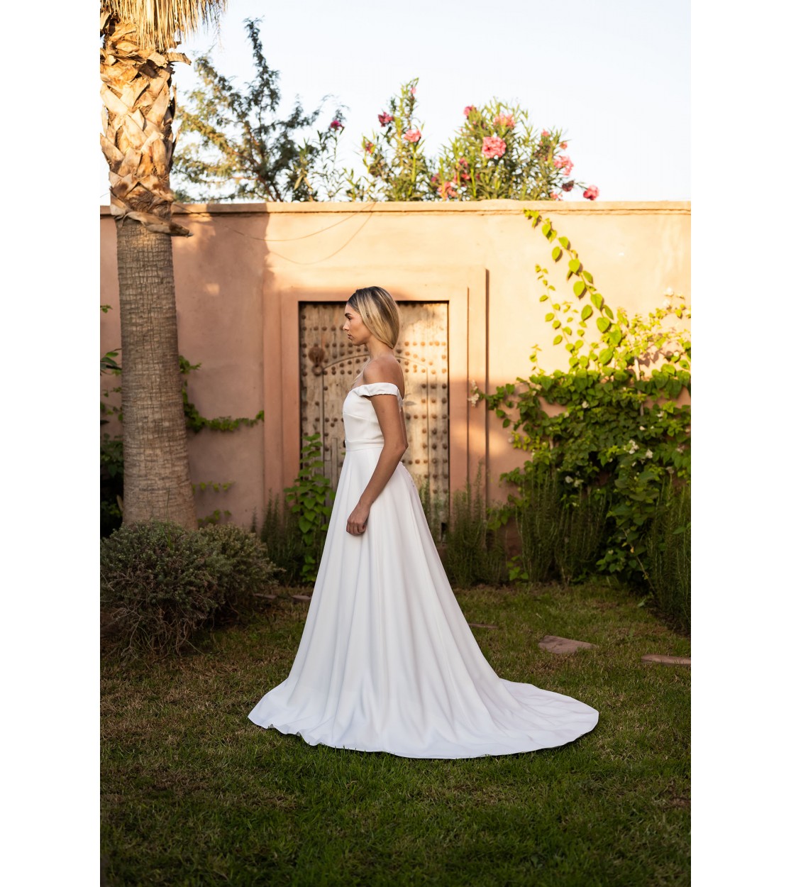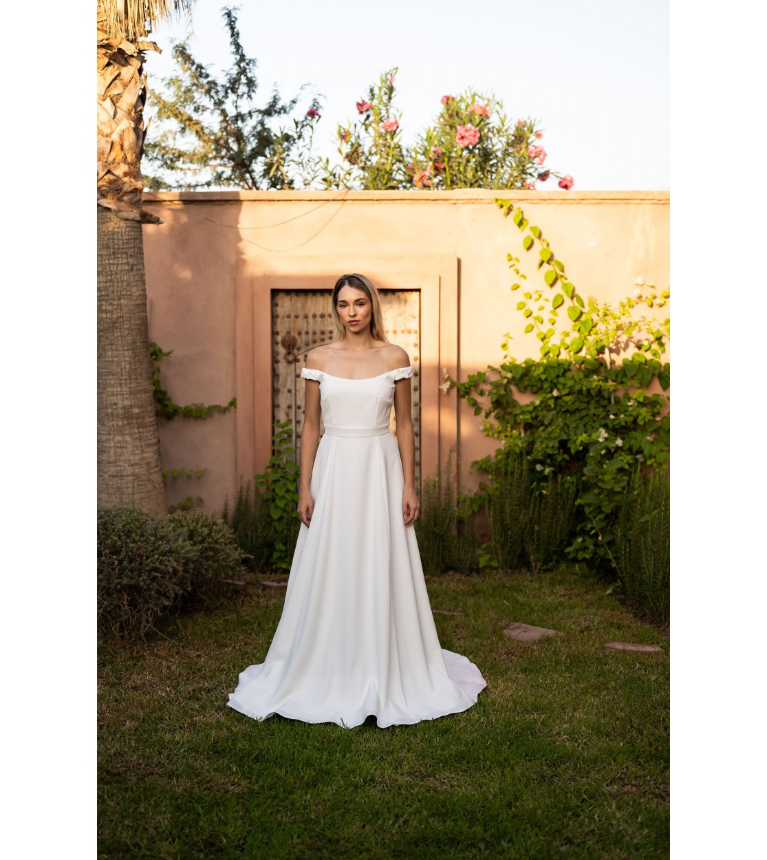 Bohemian wedding dress with a bardot neckline, crafted from a slightly satin double crepe that gives it a sublime texture. The off-the-shoulder design brings mystery and femininity. With its wide skirt and small train, this gown embodies elegance and modernity.