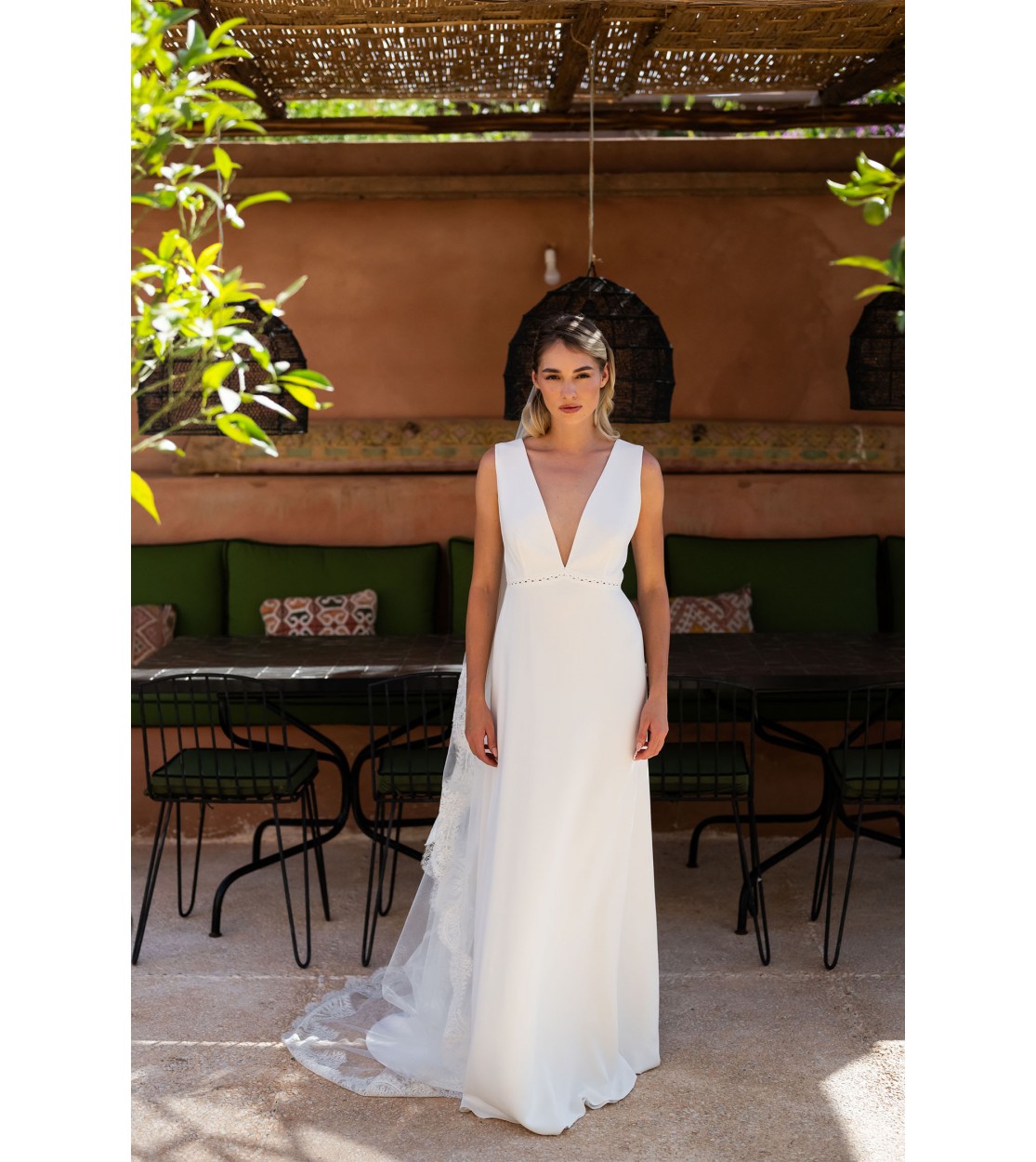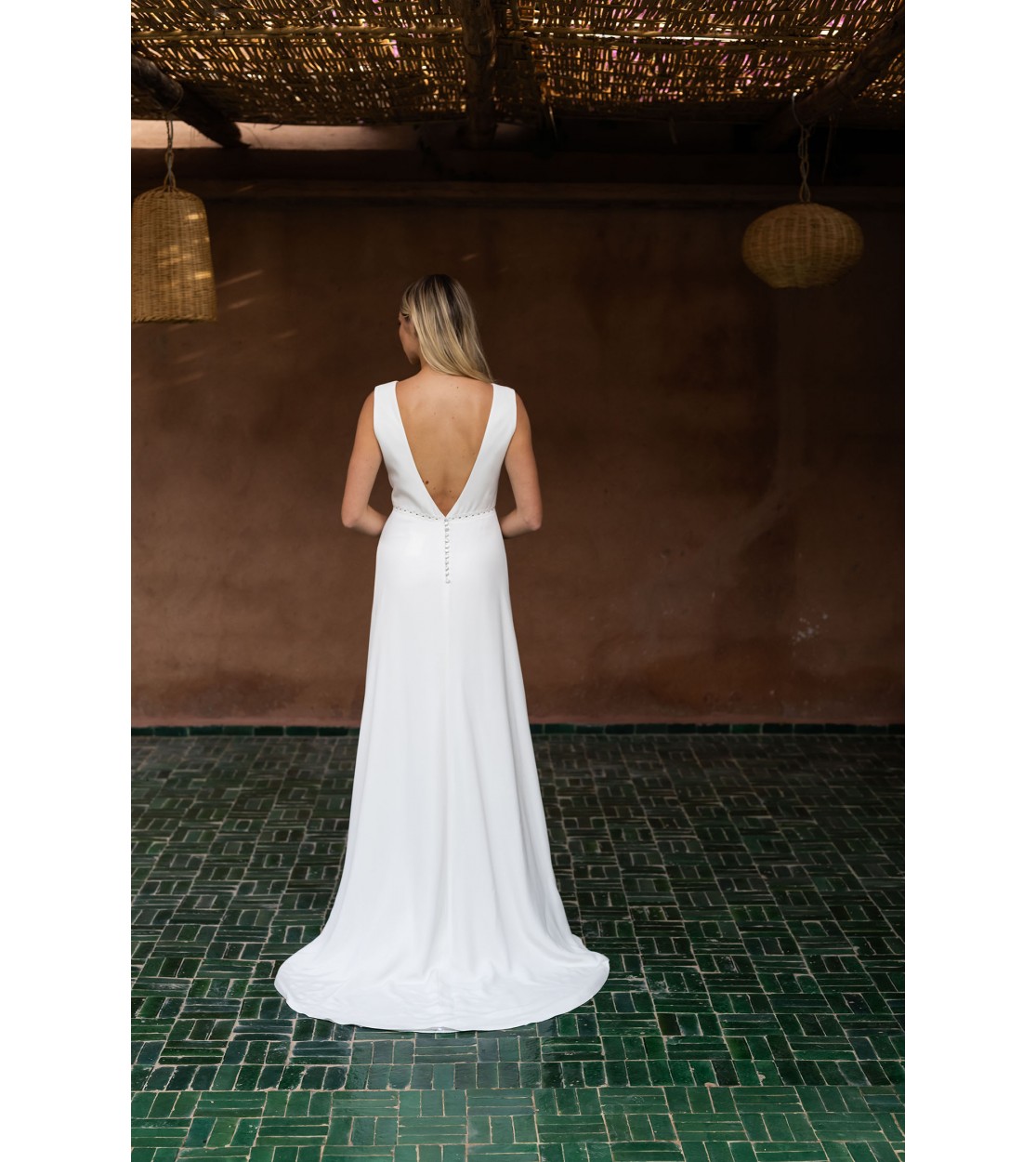 A deep neckline subtly enhances femininity, while the captivating open back is adorned with a delicate sheer braid, blending sensuality with refinement. The column skirt, extended by a small train, elongates the figure and creates a chic, timeless allure.
