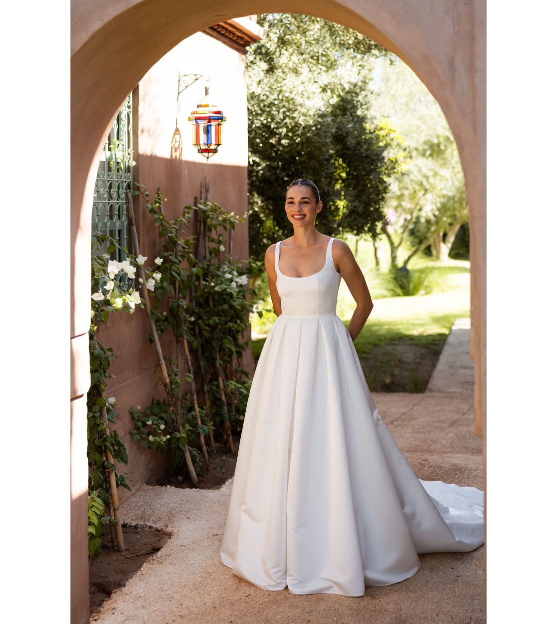 This majestic creation enchants with its regal volume and refined brilliance. Crafted in duchess satin, it embodies the perfect balance between modernity and timeless classicism.