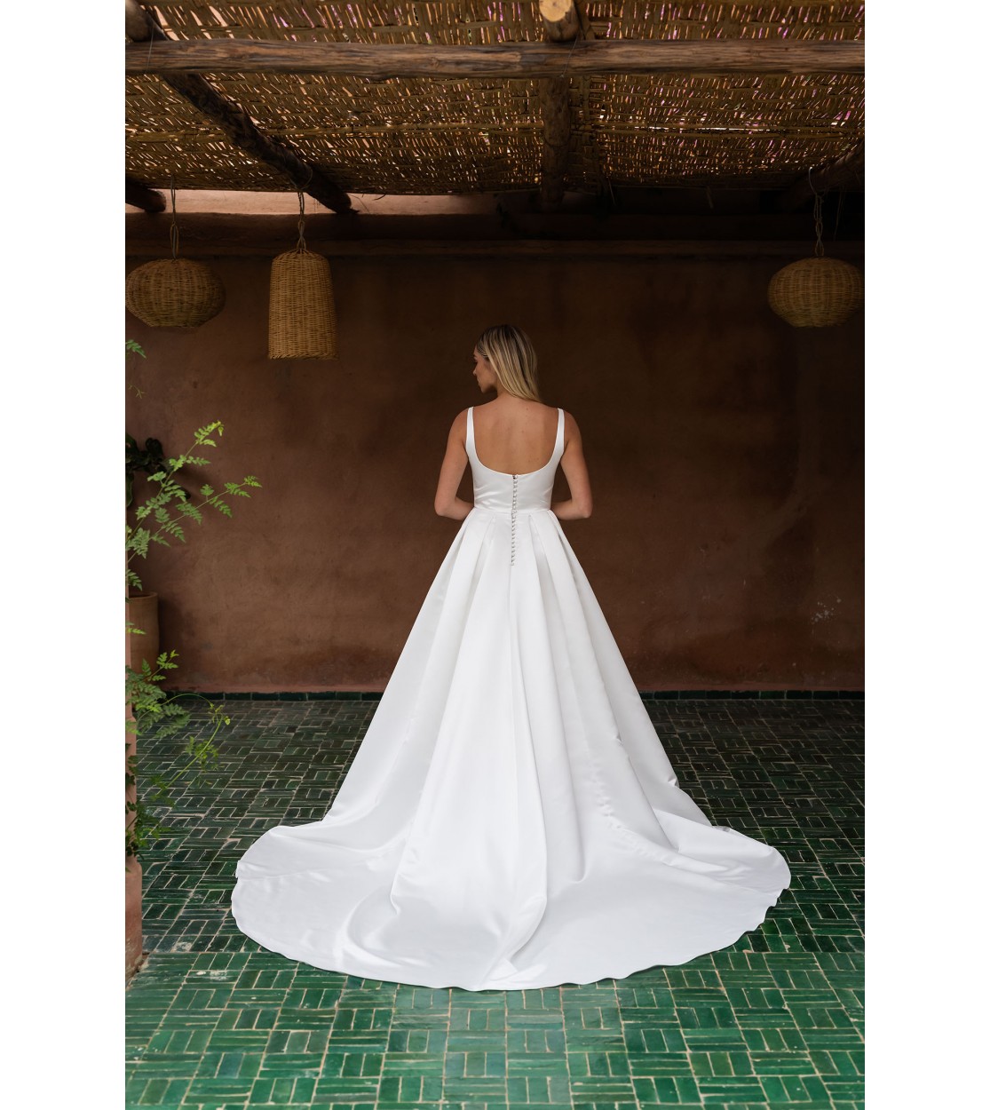 This majestic creation enchants with its regal volume and refined brilliance. Crafted in duchess satin, it embodies the perfect balance between modernity and timeless classicism.