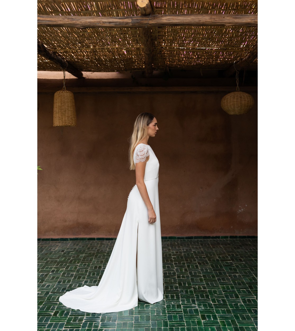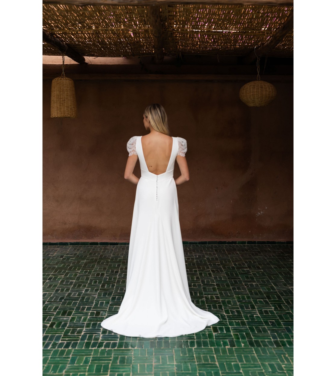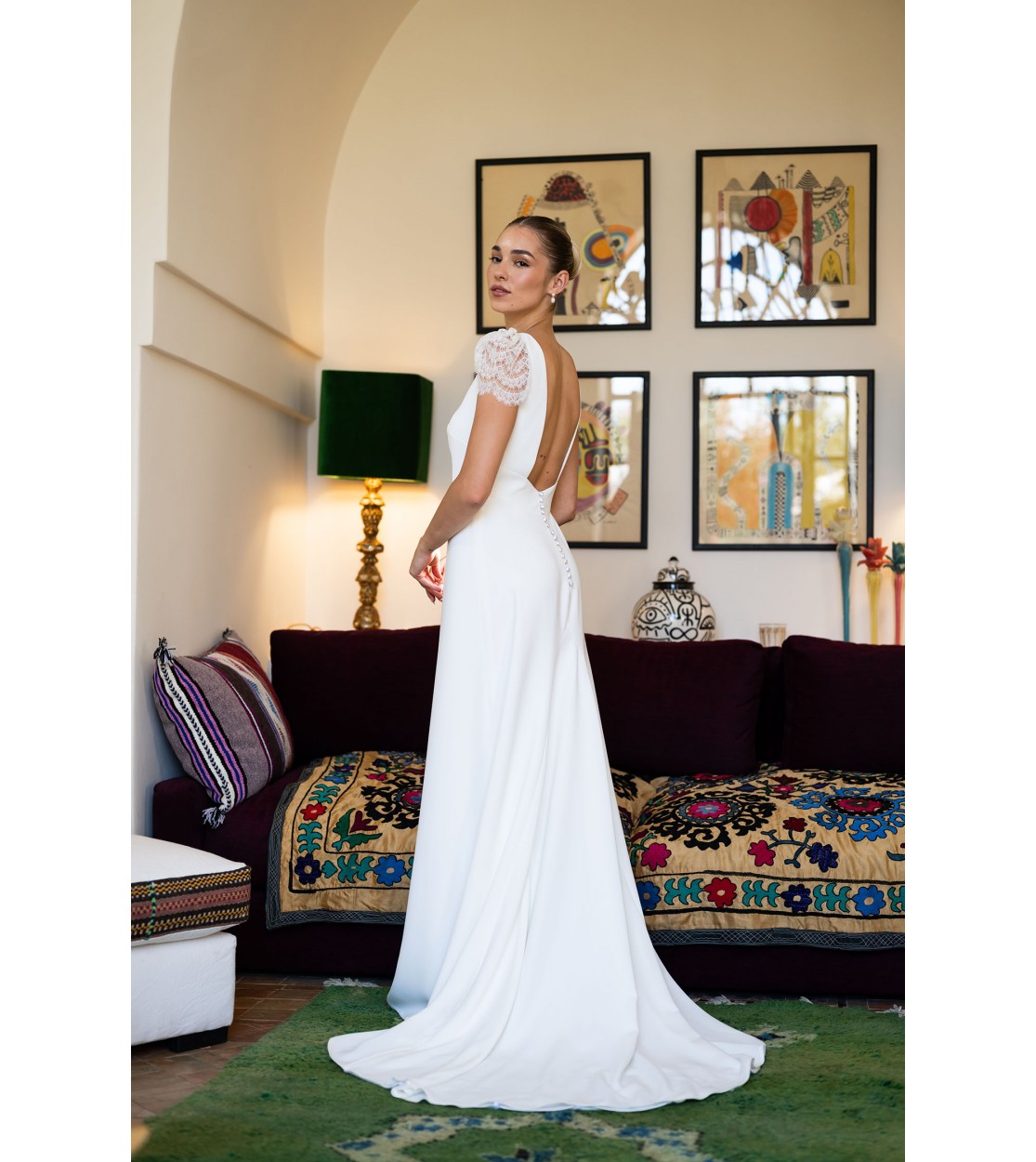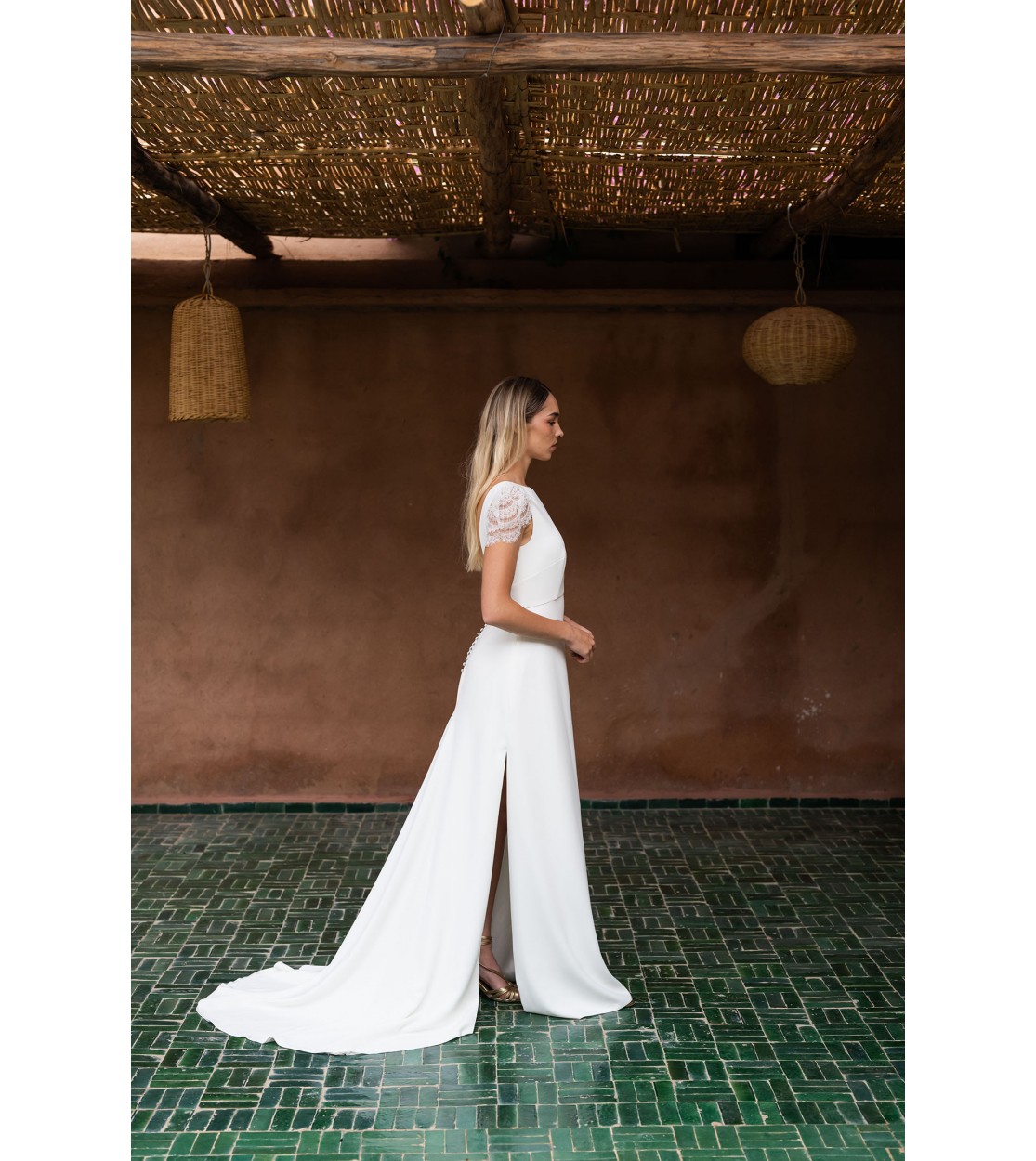 This majestic creation enchants with its regal volume and refined brilliance. Crafted in duchess satin, it embodies the perfect balance between modernity and timeless classicism.
