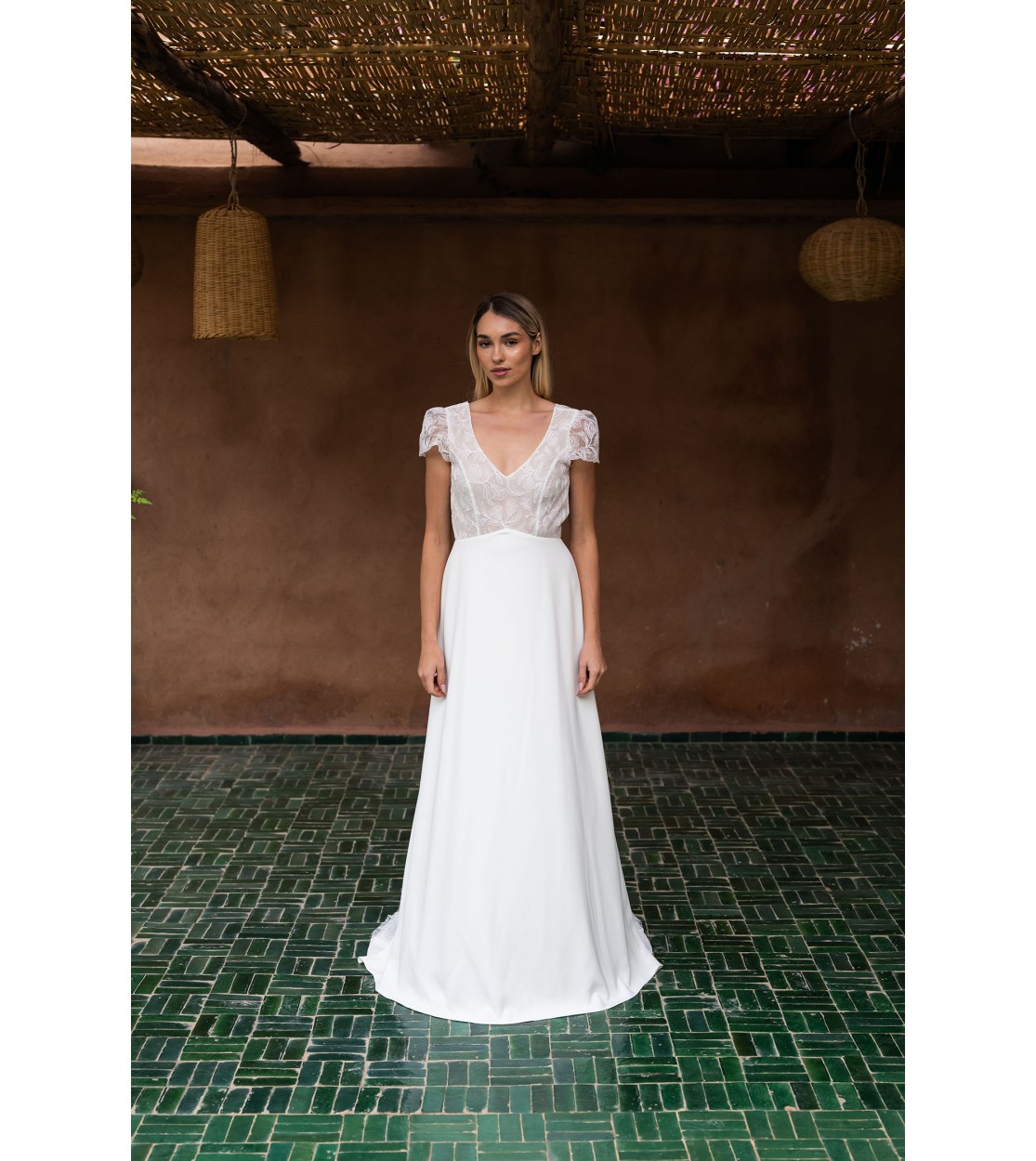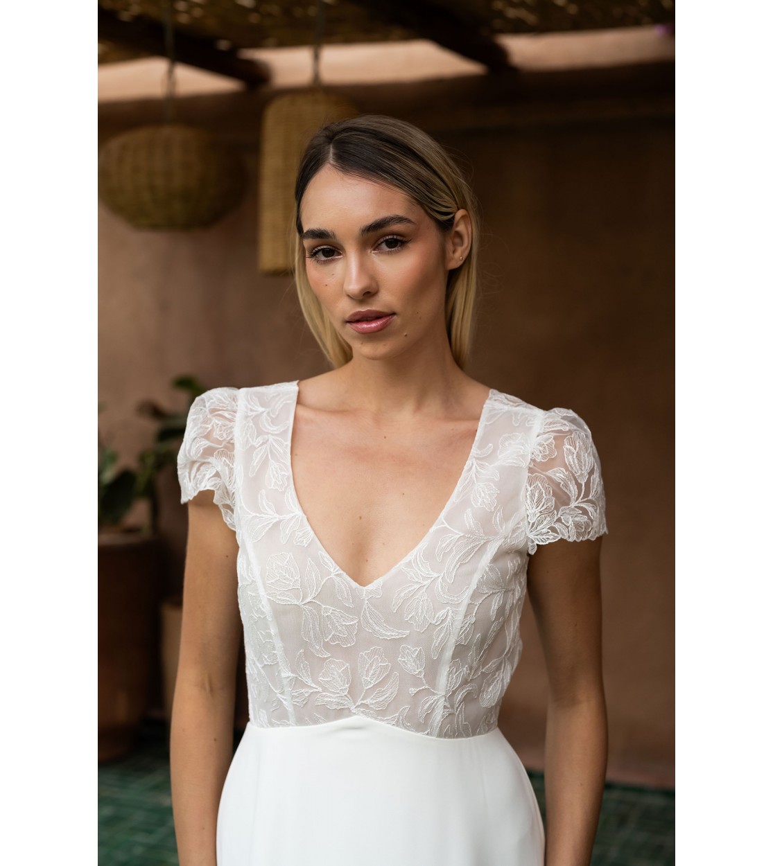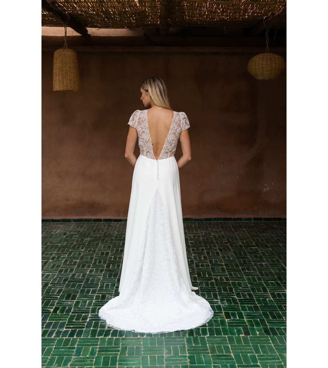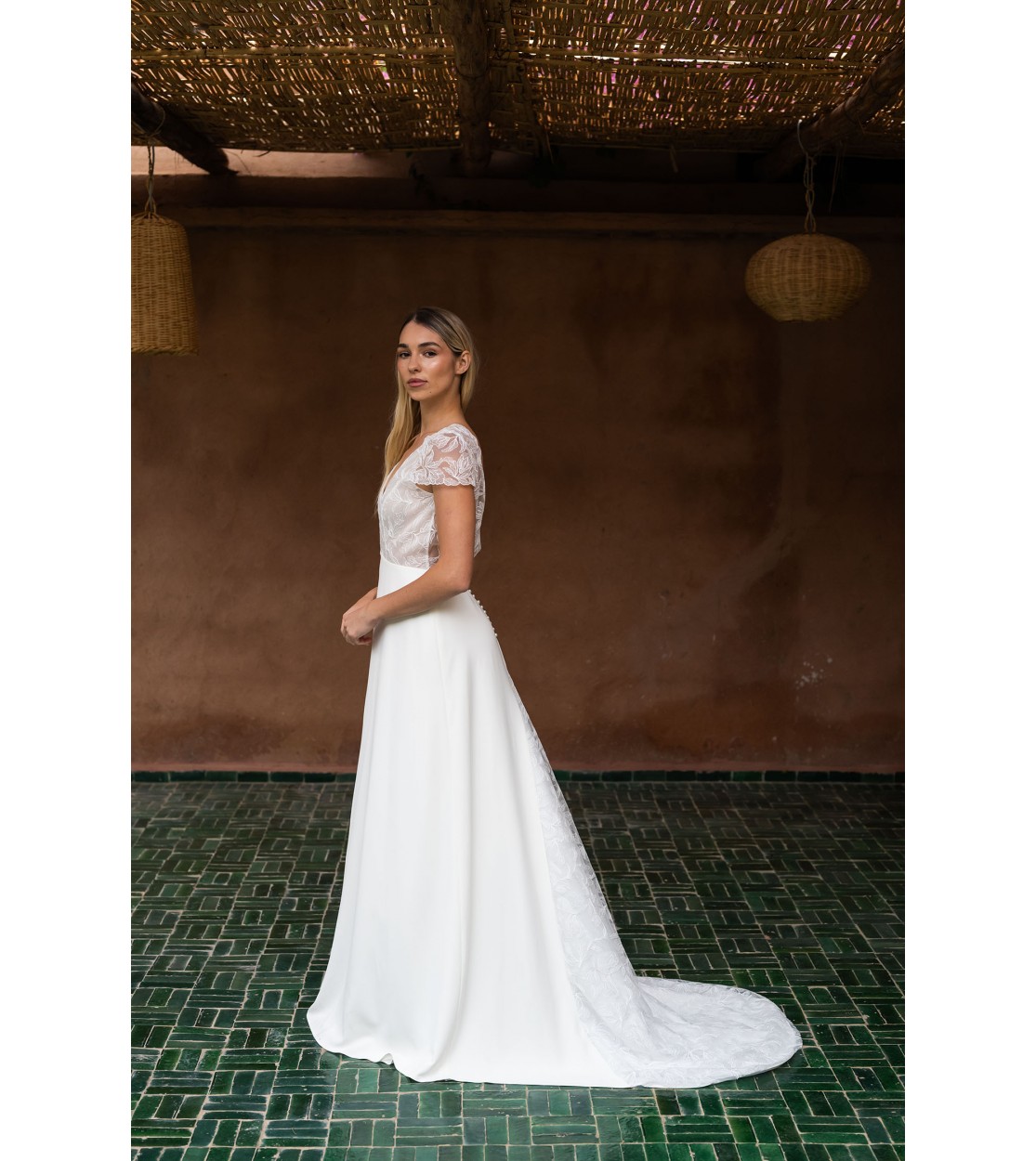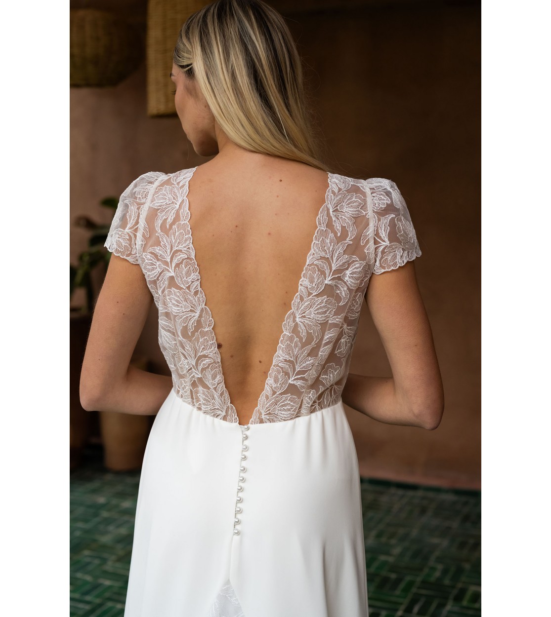 The slightly flared crepe skirt elongates the silhouette and is adorned with a stunning lace godet, bringing lightness and graceful movement to the gown.