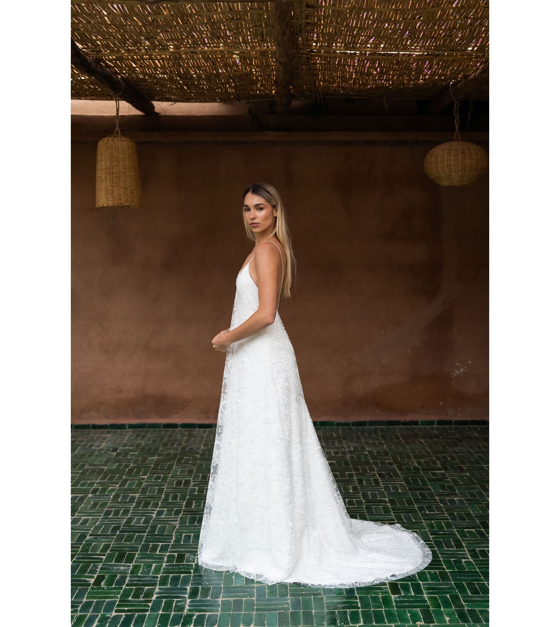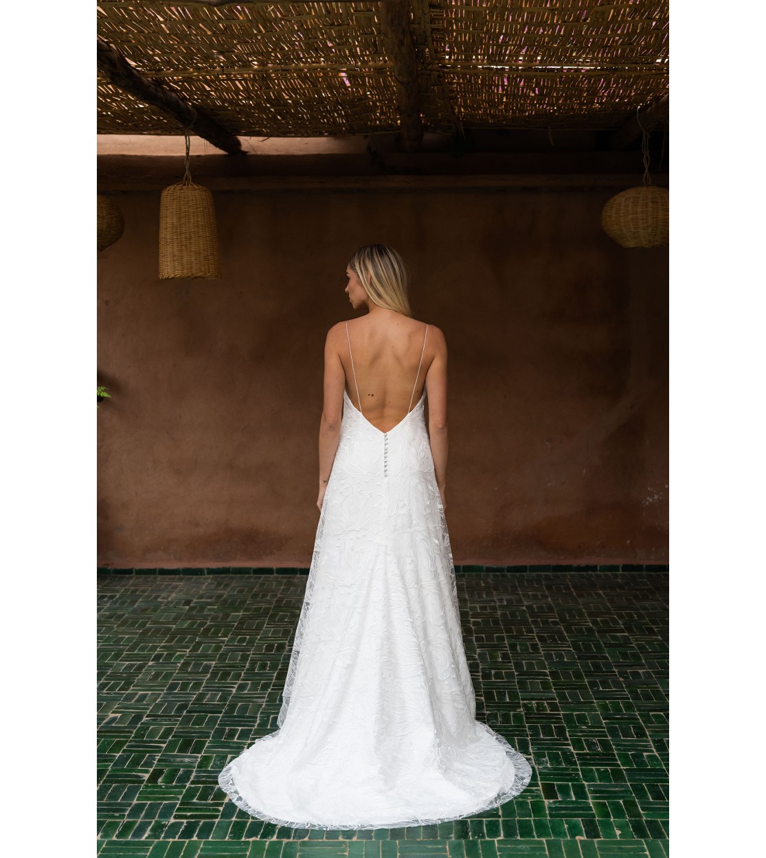 A perfect blend of sensuality and romance, the Magnolia wedding dress enchants with its delicate transparency and bohemian lines.