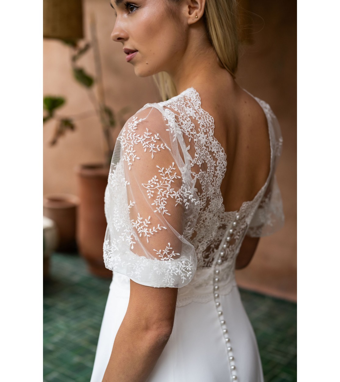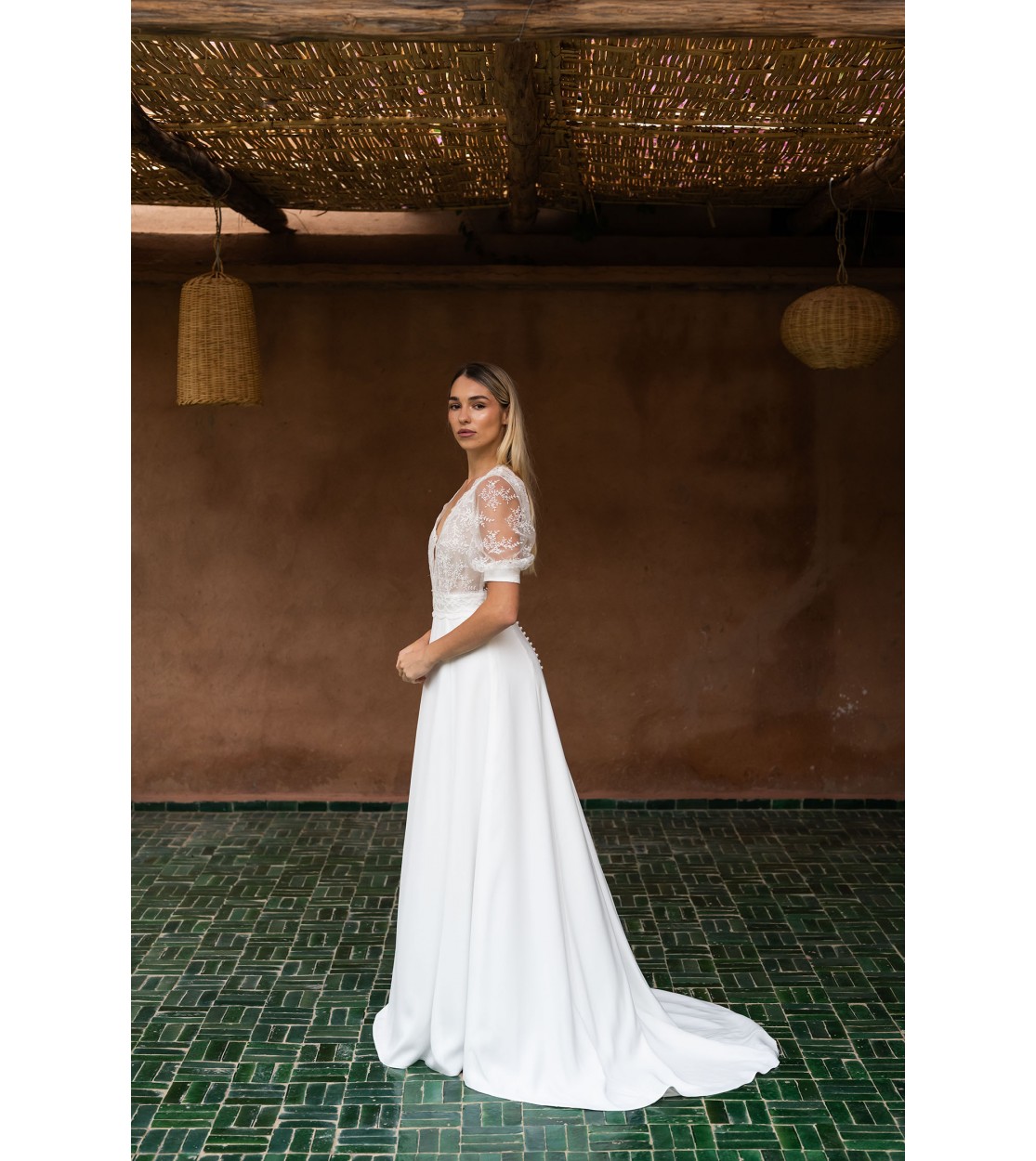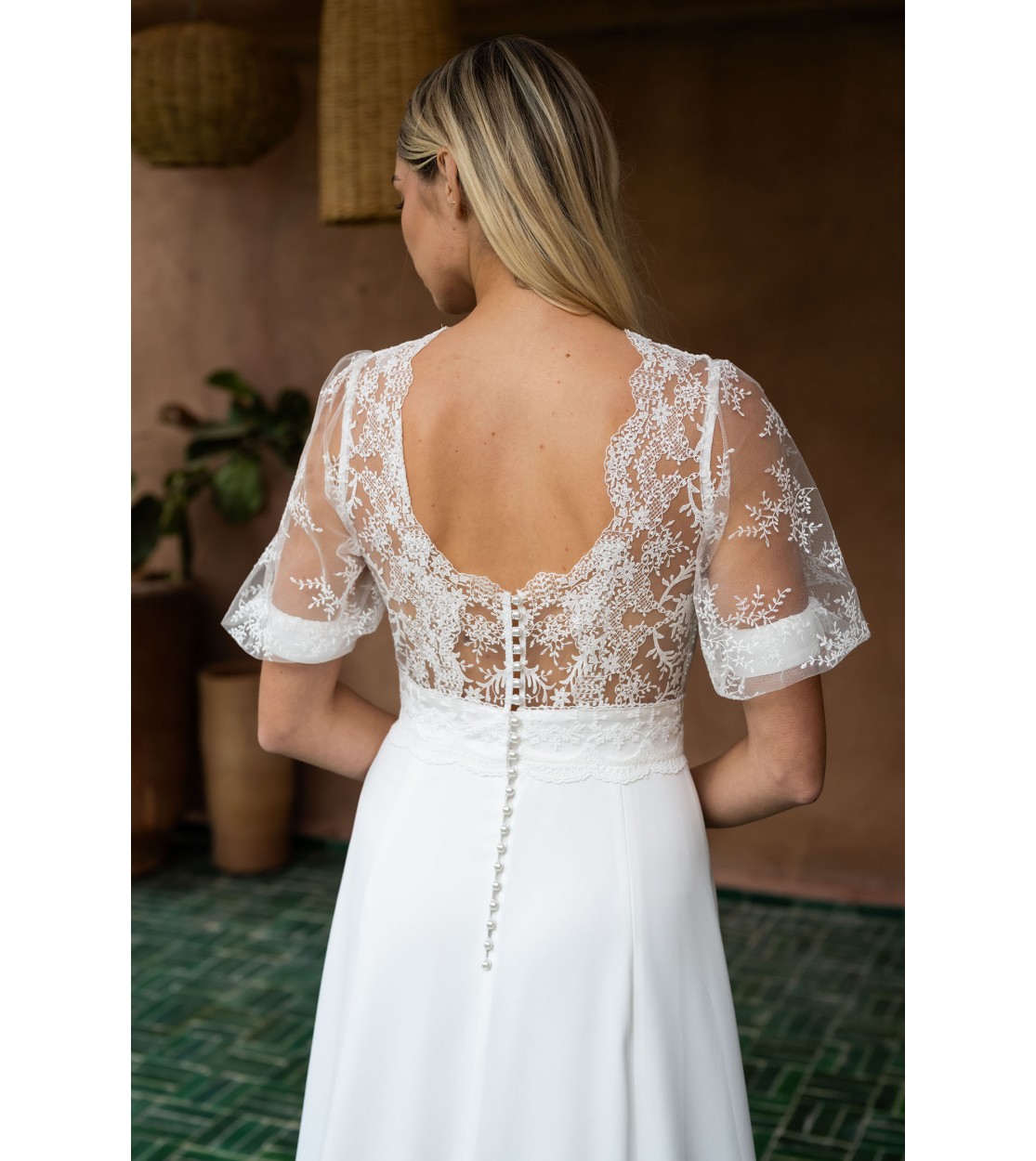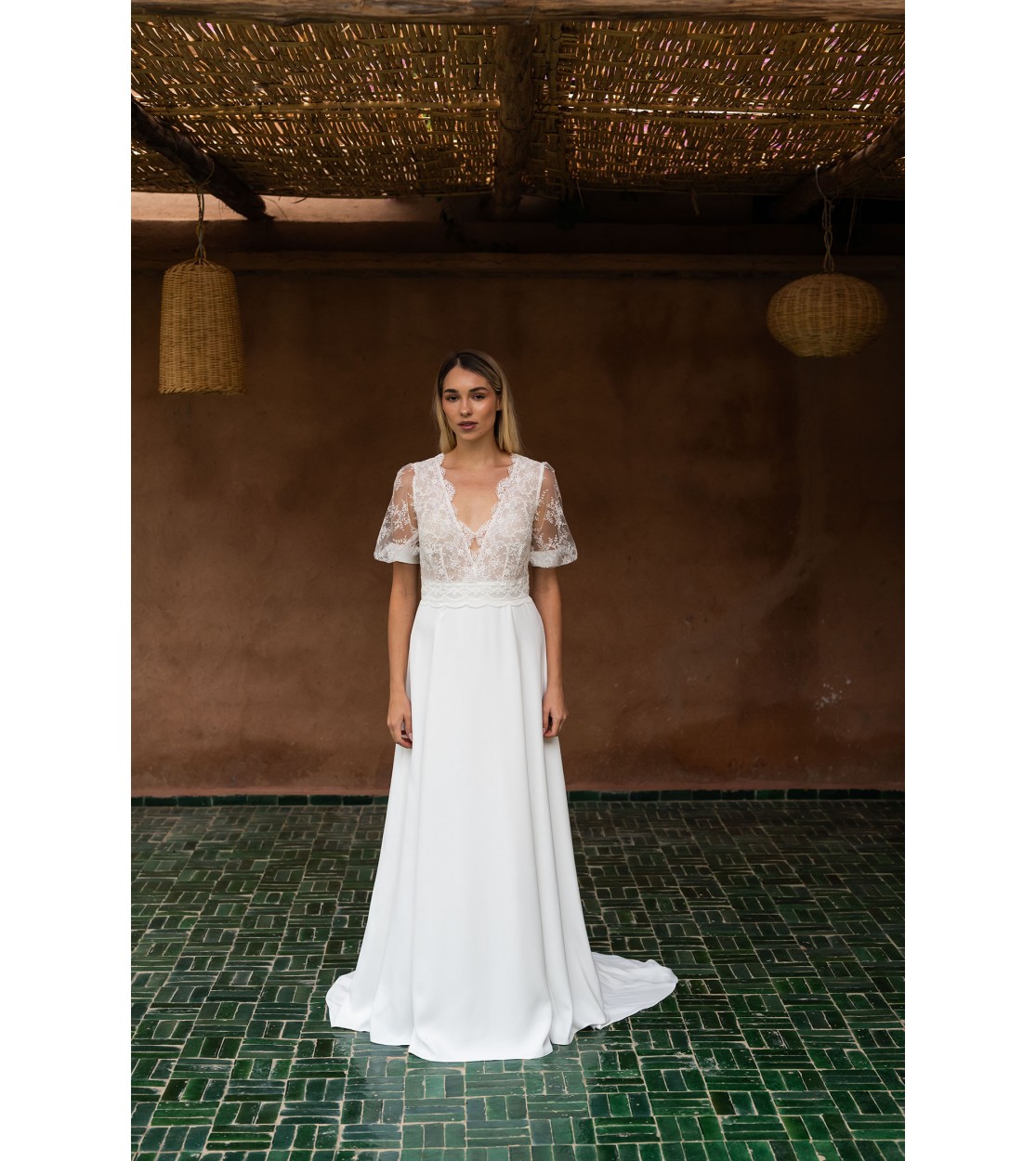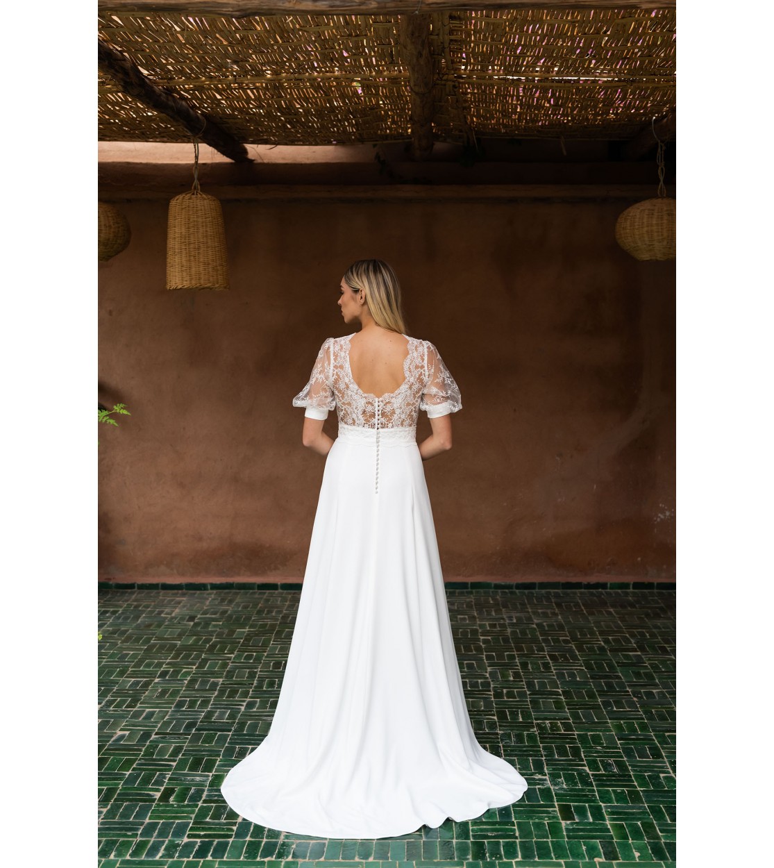 The bodice rests on a lace waistband that beautifully defines the silhouette before flowing into a wide crepe skirt, bringing a solemn and timeless dimension to the gown.