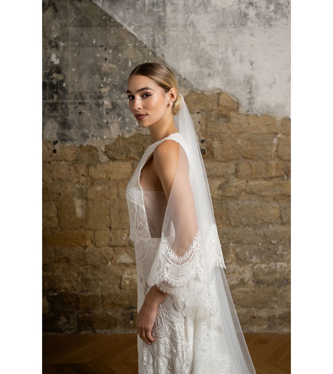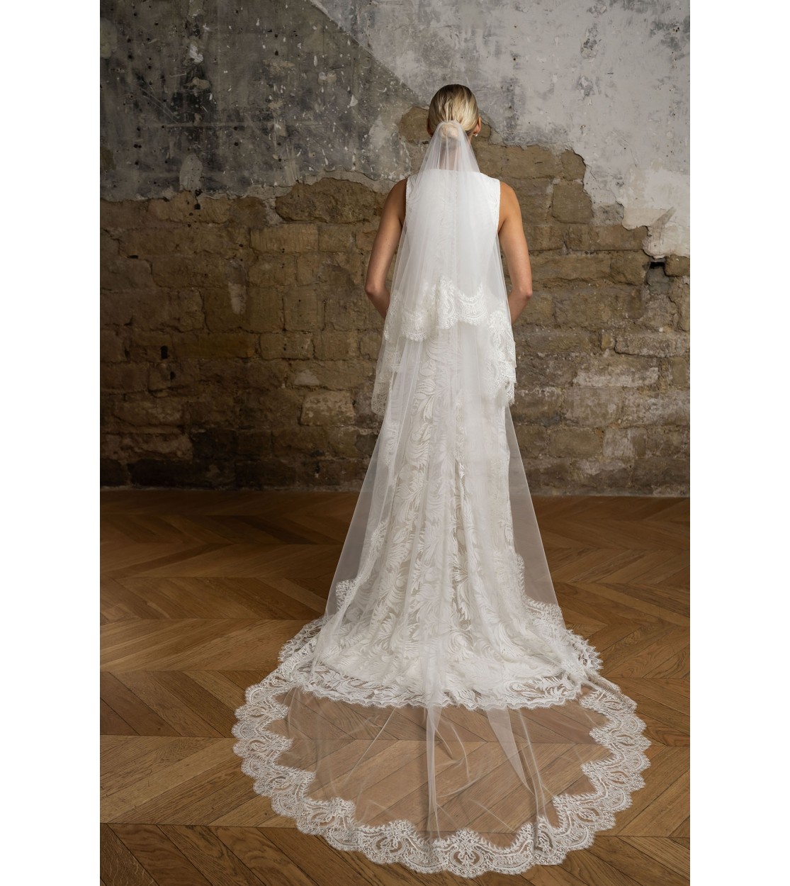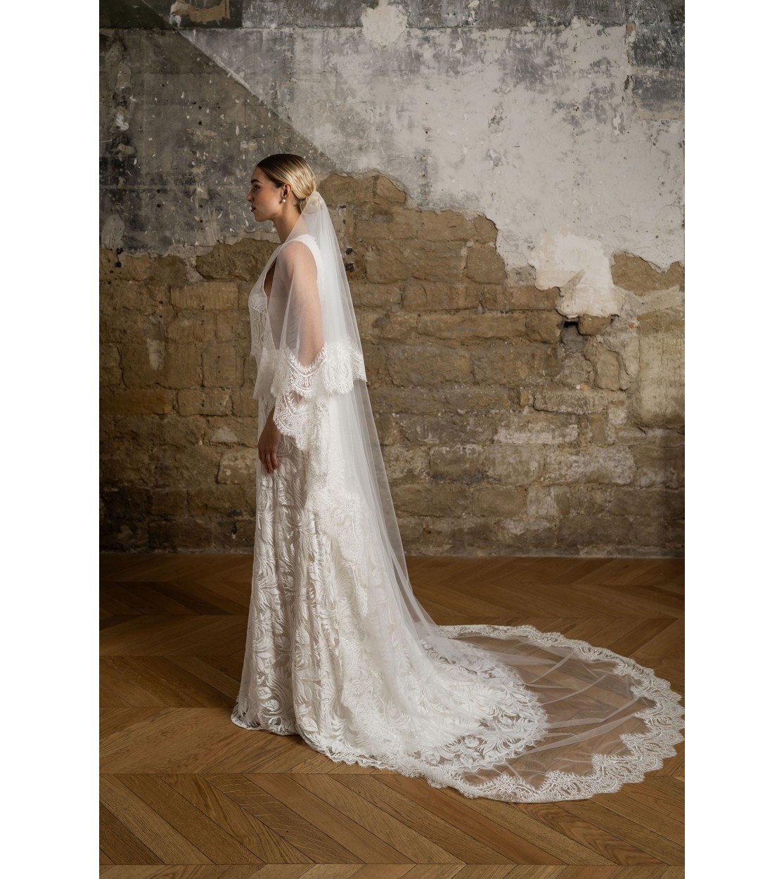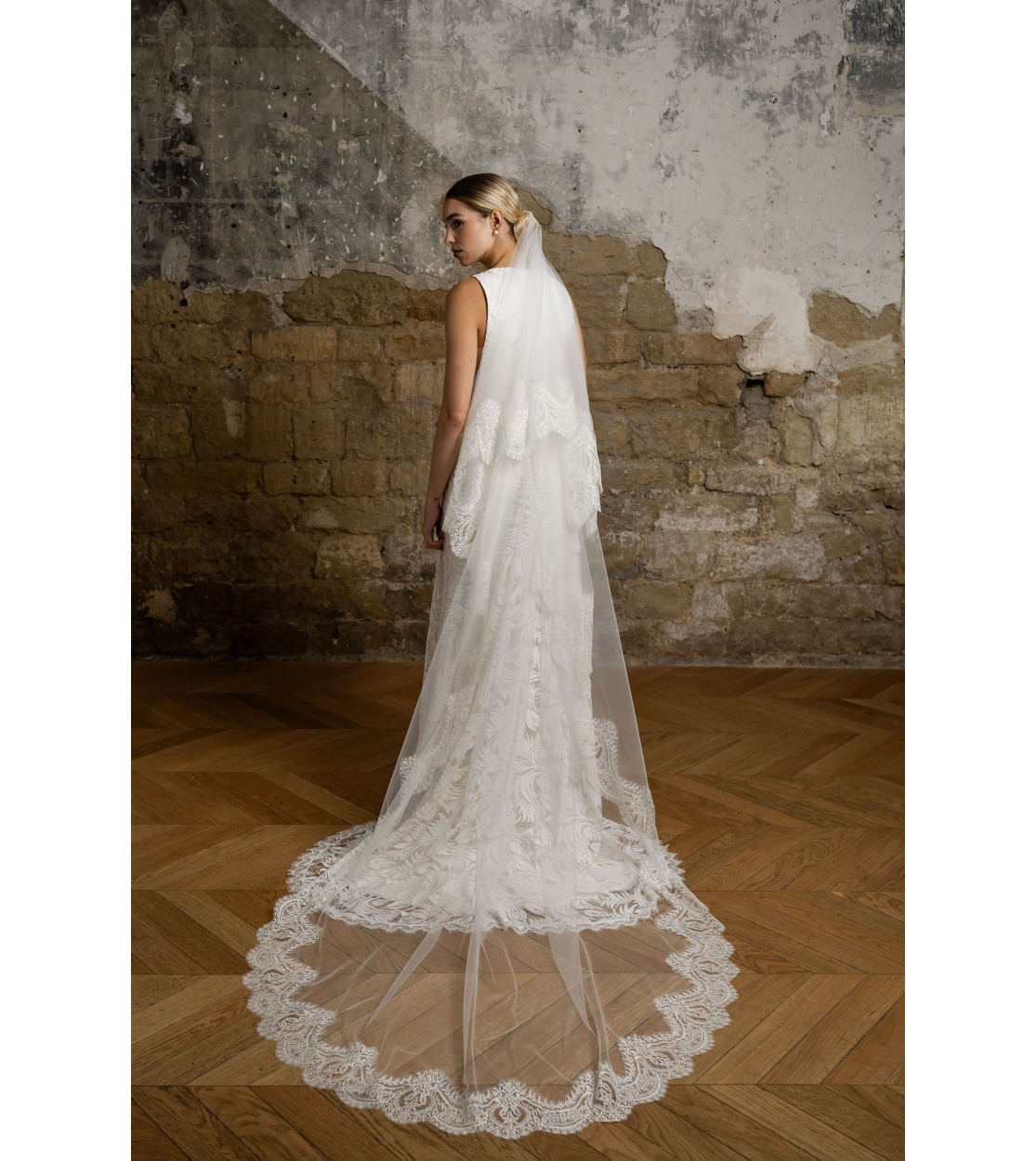 Family veil revisited of 3 meters, cathedral type all in lace sewn by hand. The veil has a wide vintage lace entirely applied around the veil that turns to come to rest at the elbows. This veil falls in finesse on the back and gives elegance. Classical style the veil is pricked in the hairstyle of brides.