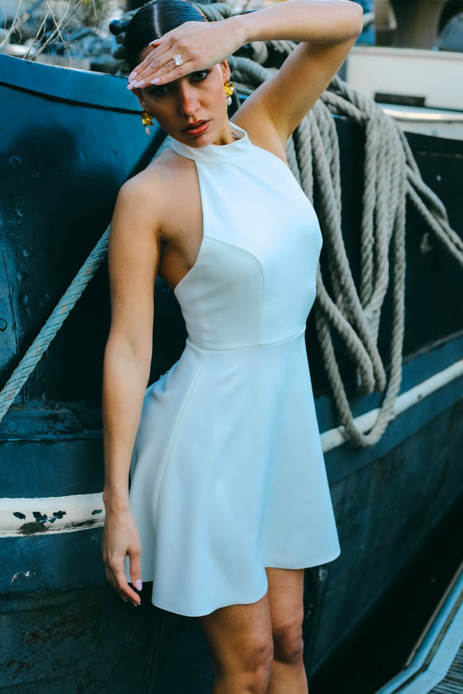 Bianca est la robe idéale pour une mariée en quête d’un look chic, minimaliste et audacieux, parfaite pour une cérémonie civile ou un mariage d’été.