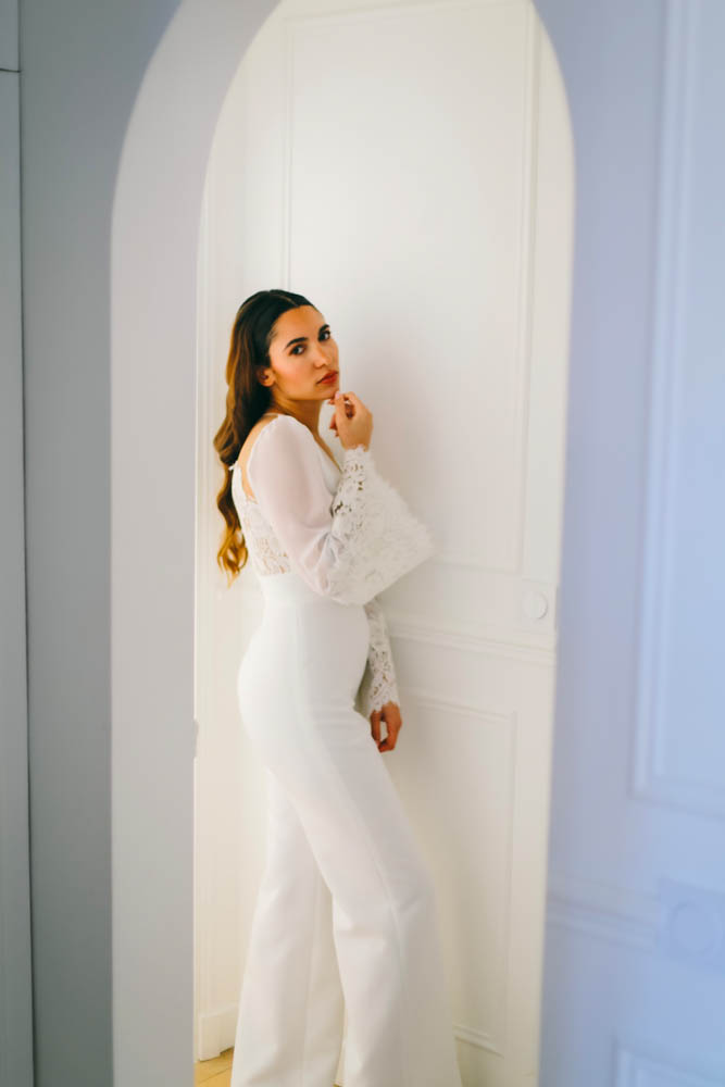 Combinaison de mariée civile chic et moderne, parfaite pour mariage à la mairie ou cérémonie contemporaine. Cette combinaison de mariée blanche élégante se distingue par son top en dentelle délicate dentelle de Calais brodée à la main, subtilement transparente au dos avec une fermeture boutonnée raffinée, apportant une touche romantique et féminine. Ses manches longues en mousseline légère avec poignets en dentelle ajoutent douceur et sophistication.