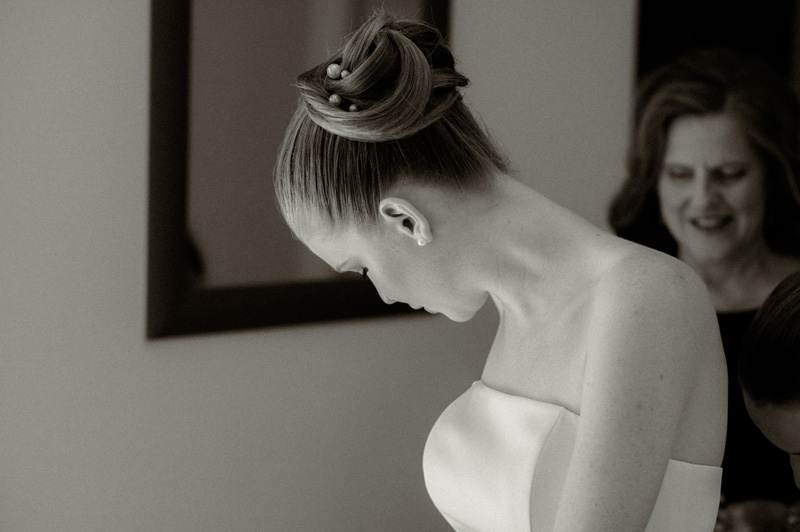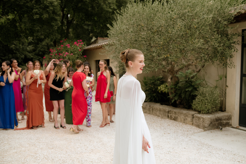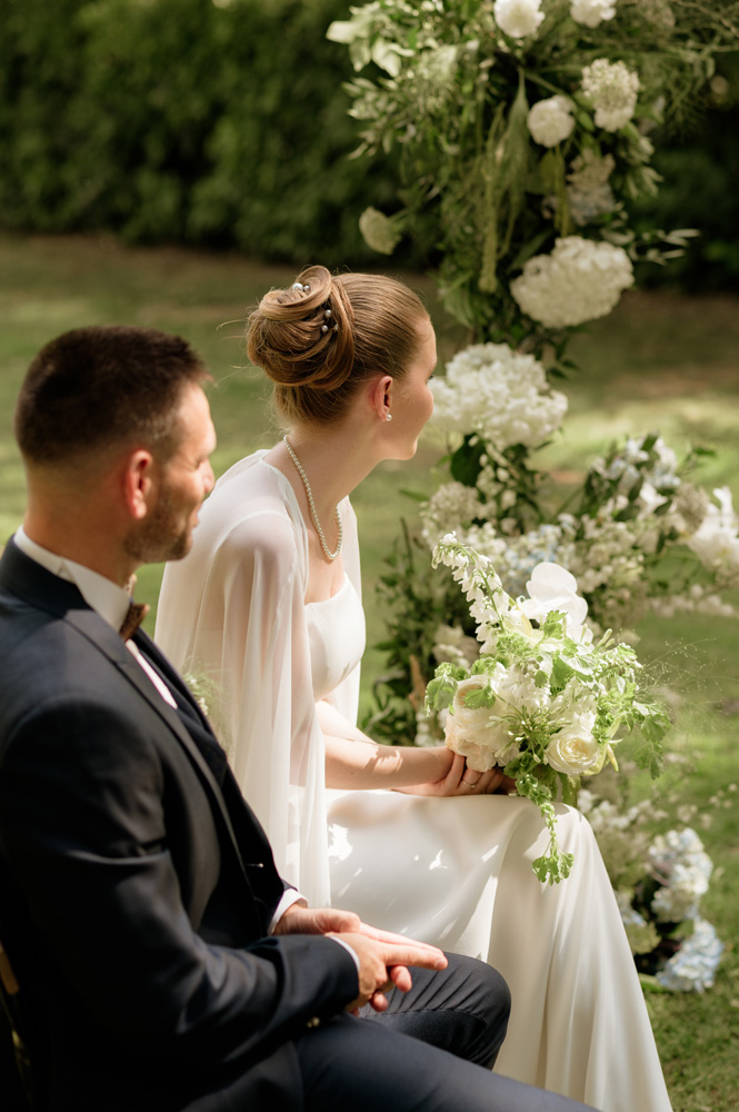 On m’avait toujours dit que lorsqu’on essaye LA robe, on le sait immédiatement et je dois dire que je n’y croyais pas trop, je pensais que le choix allait être difficile… pourtant cela a été un vrai coup de cœur ! J’ai fait mes essayages avec ma sœur (aussi ma témoin), ma mère et ma grand-mère. Chez Harpe, toutes les robes étaient magnifiques, mais lorsque j’ai essayé celle-ci, ce fut une évidence : unanimement validée par ma famille, et surtout par moi. Je me suis sentie totalement moi-même, et c’était le plus important.