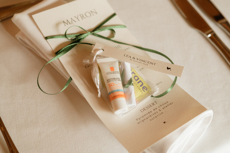 Nous voulions que notre mariage soit à notre image, personnalisé dans les moindres détails, et qu’il soit un moment unique non seulement pour nous, mais aussi pour nos invités. Nous avons beaucoup misé sur les petites attentions, sur l’ambiance conviviale et sur le fait que chacun puisse repartir avec de beaux souvenirs.