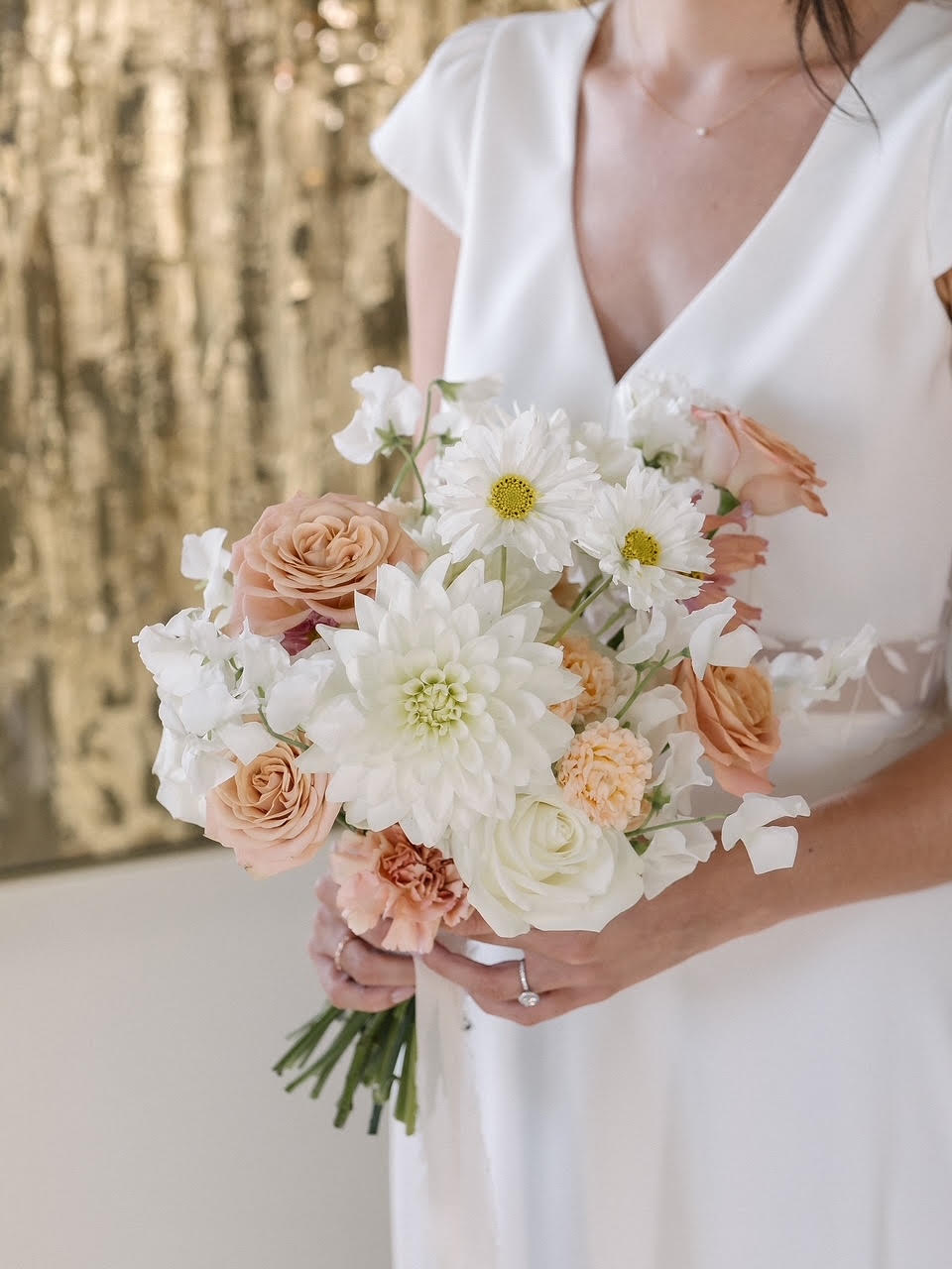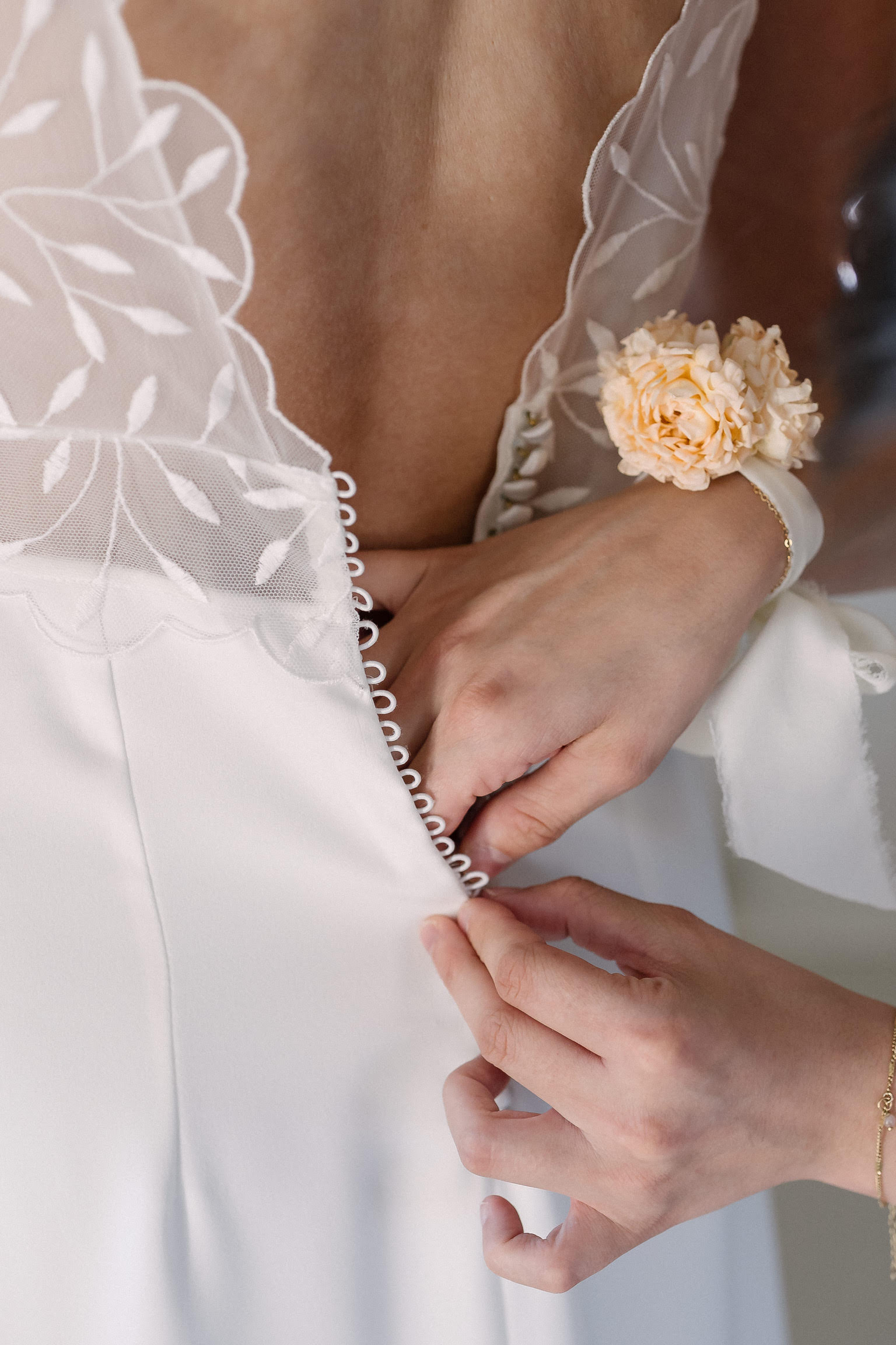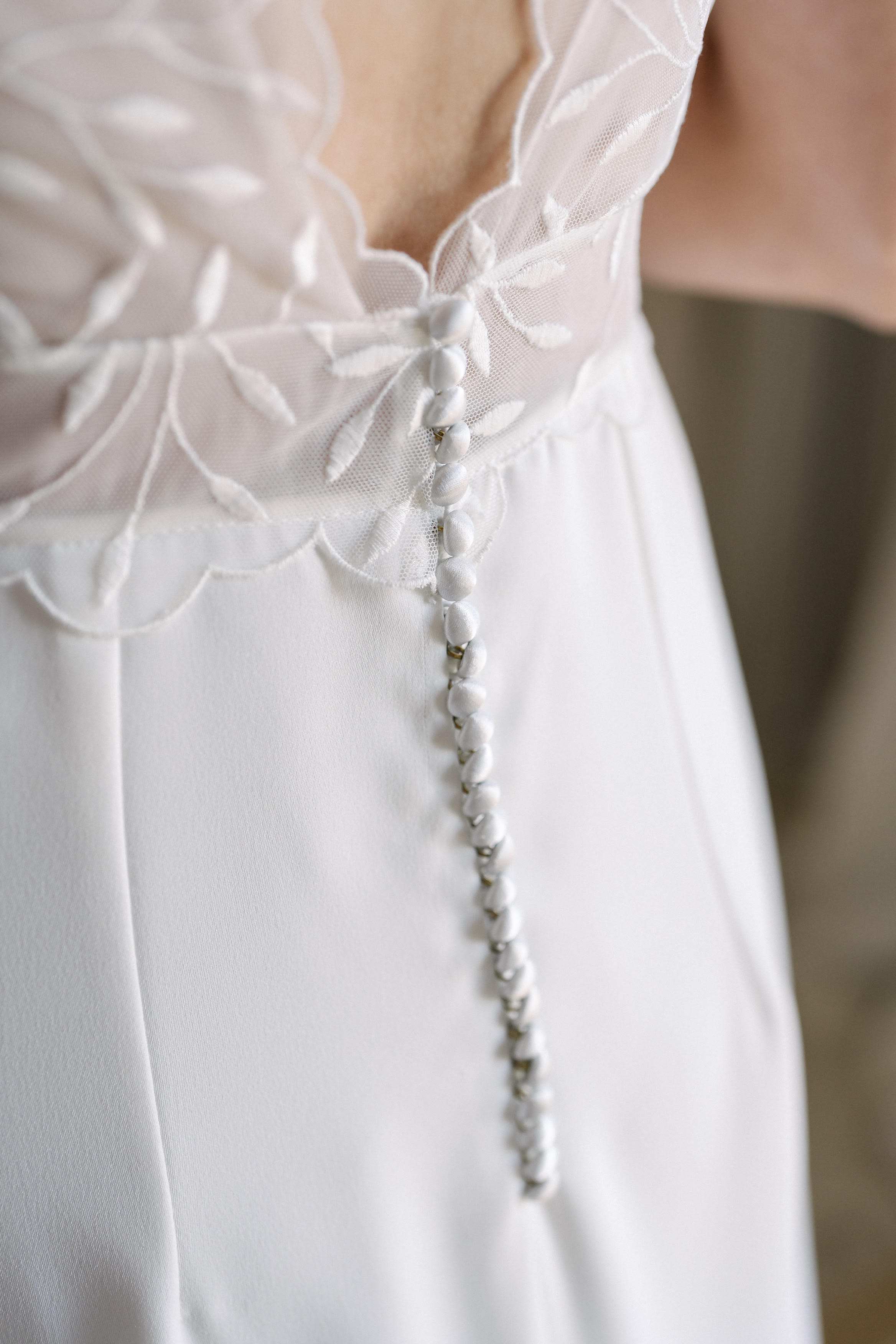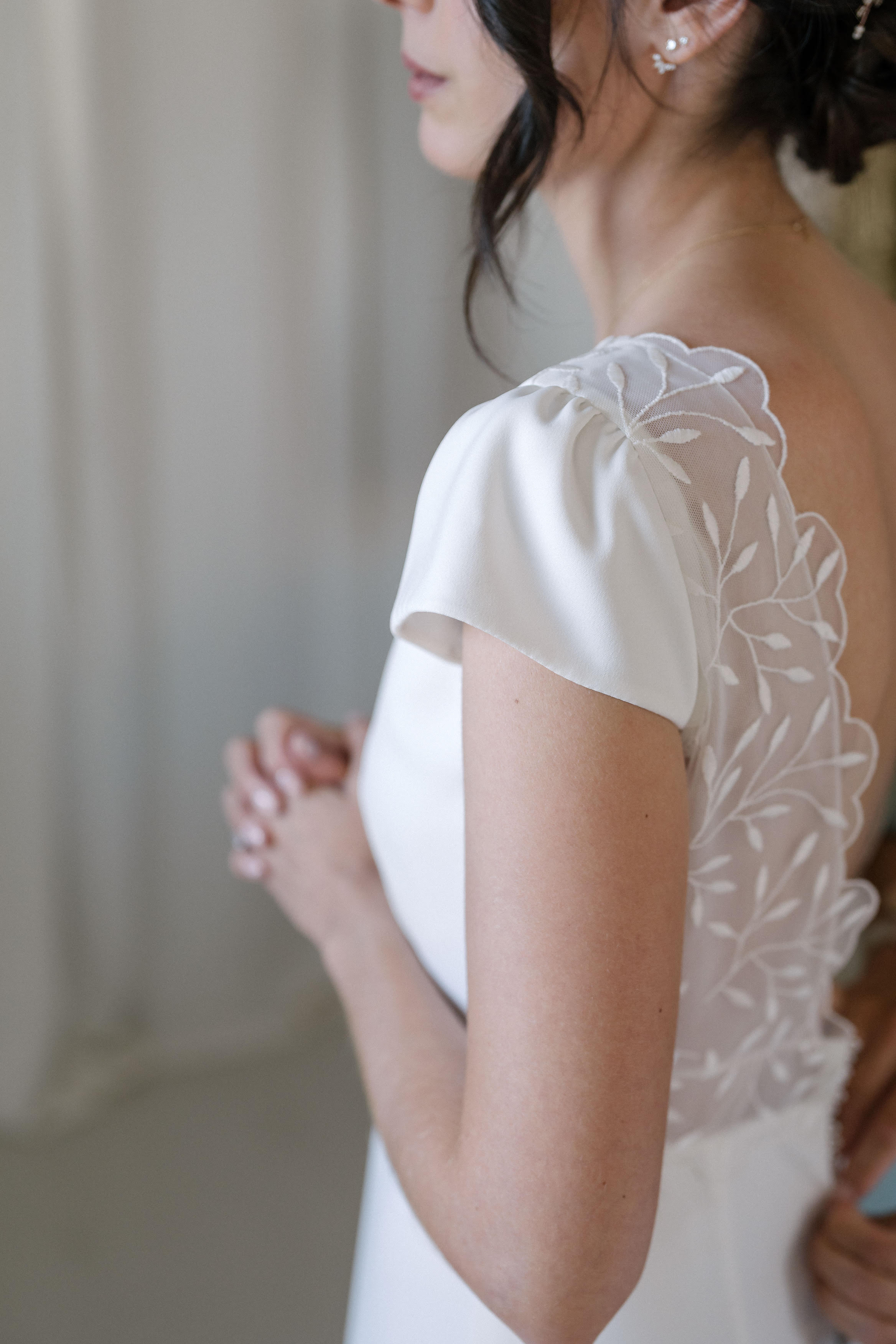 Une robe de mariée délicate, confectionnée en tulle brodé français et en crêpe, alliant légèreté et élégance.