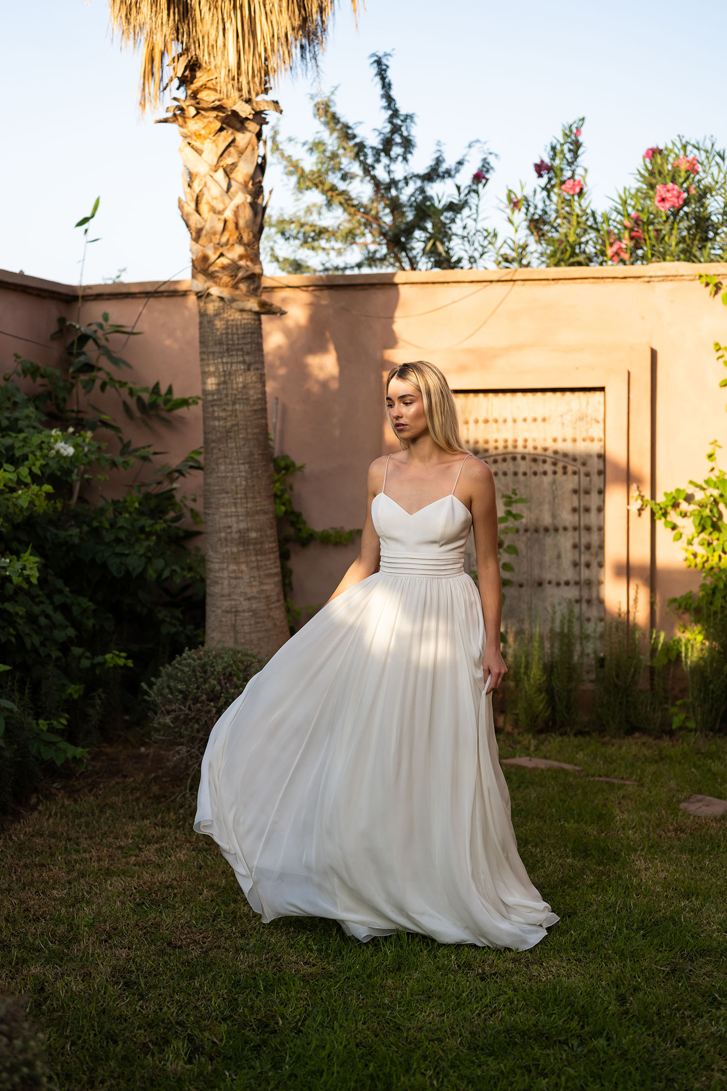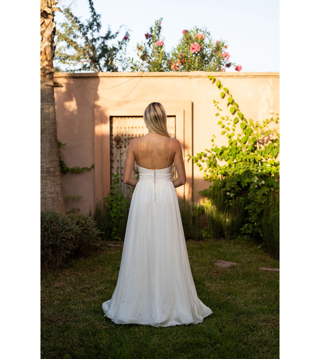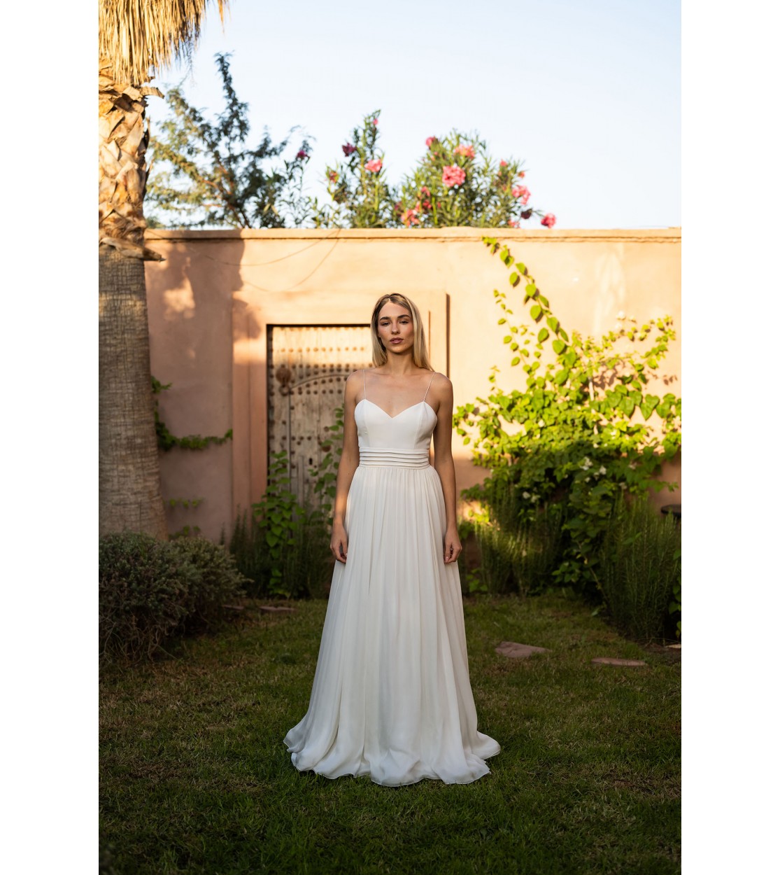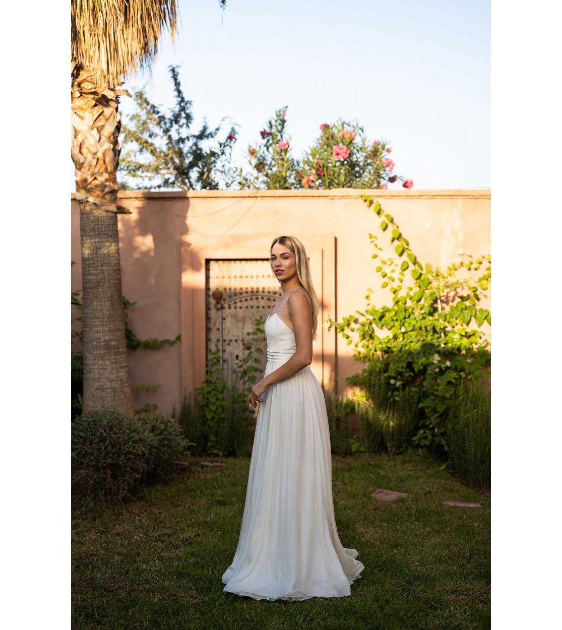 Nous avons imaginé cette robe de mariée aérienne, à la fois vaporeuse et d’un confort absolu, confectionnée dans des matières d’exception.