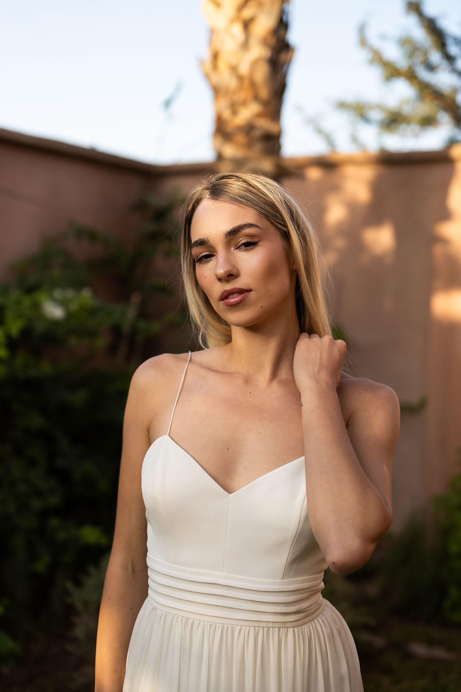 Les plis piqués ajoutent une touche d’originalité raffinée, et la jupe légère et vaporeuse s’anime au rythme des pas de la mariée.