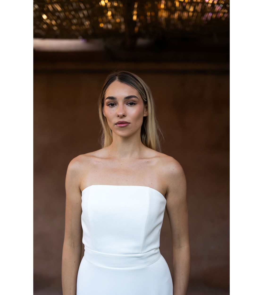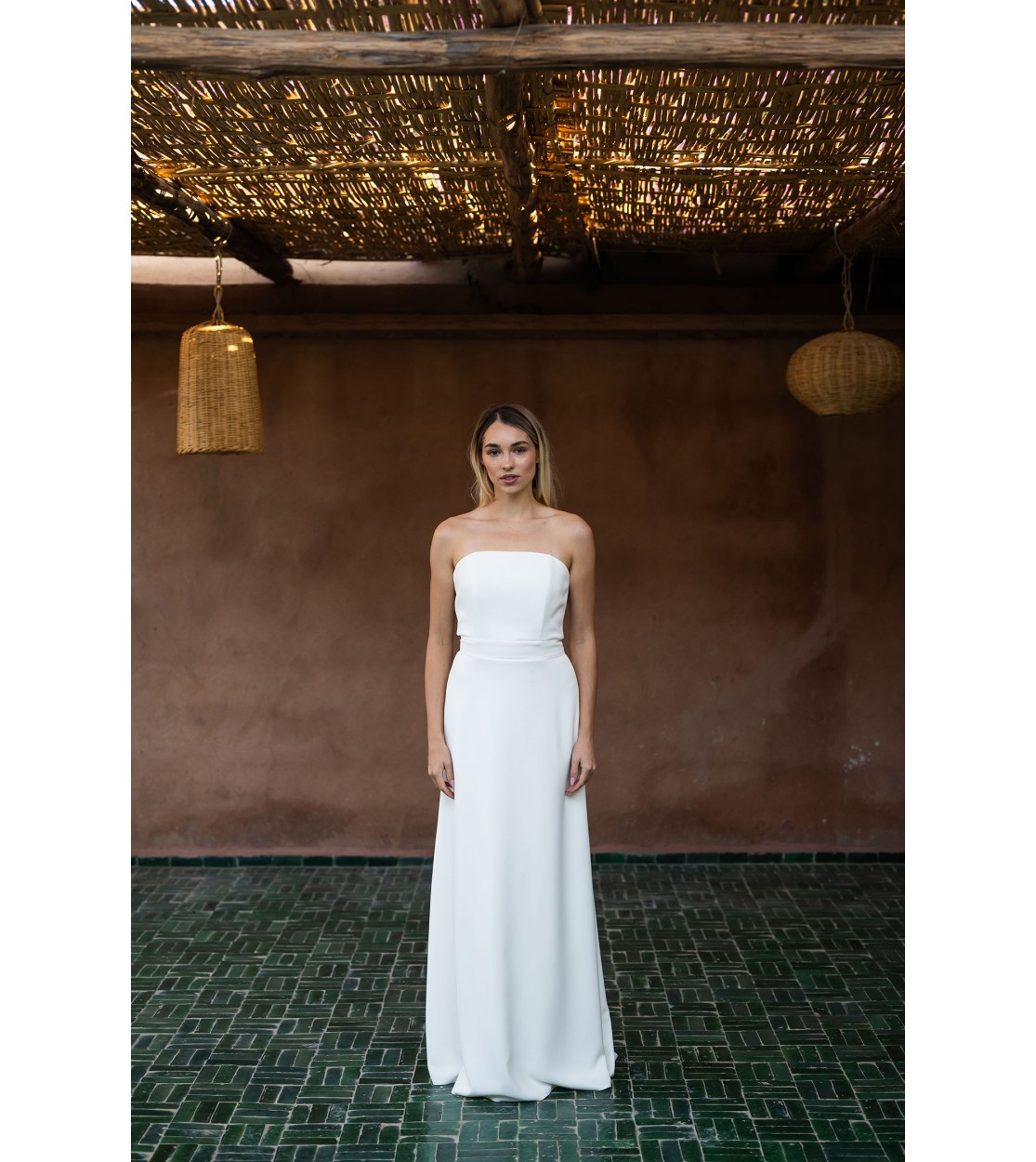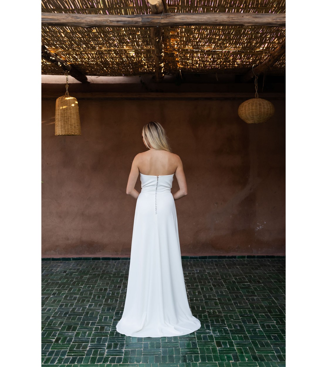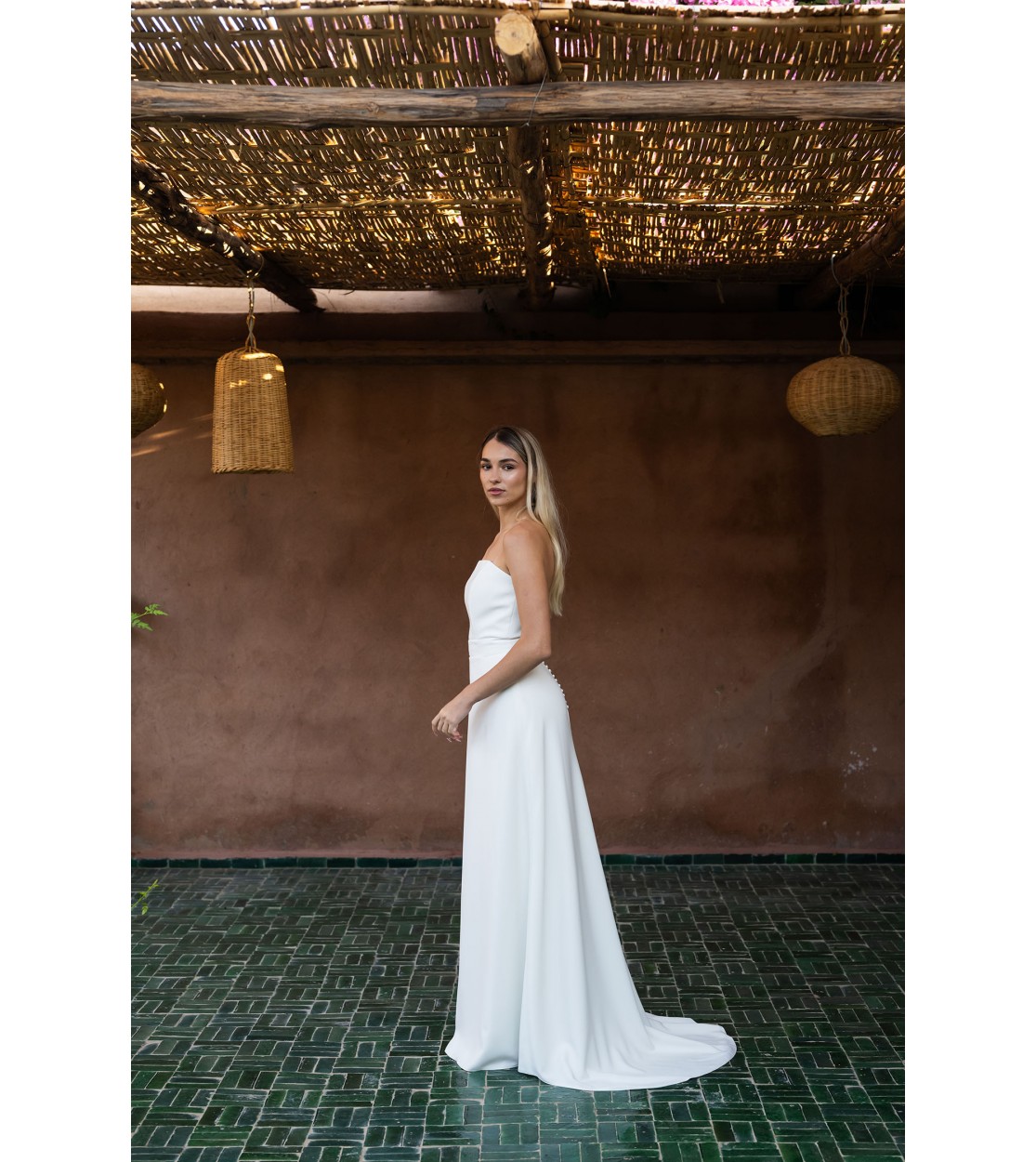 La silhouette, d’une élégance sculpturale, charme par son encolure bustier incurvée et sa jupe ample se prolongeant en une traîne subtilement dessinée.