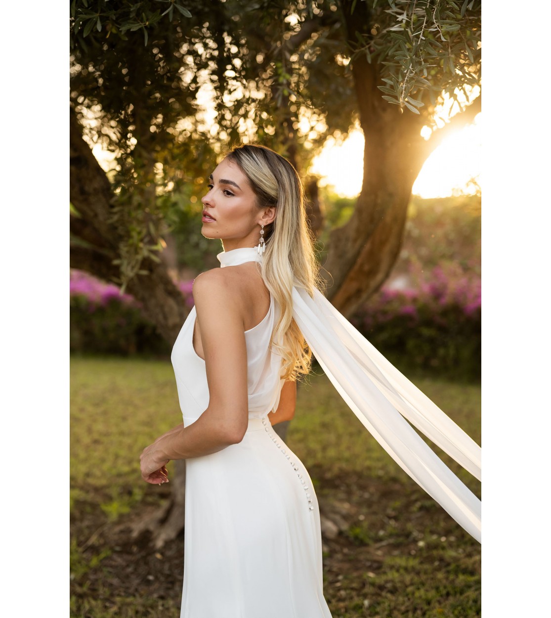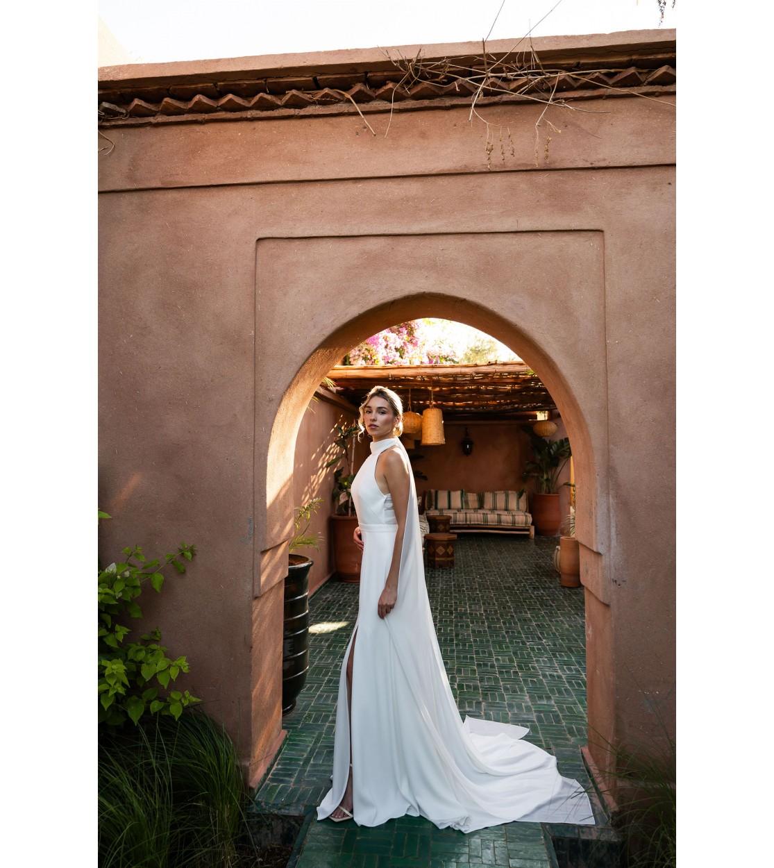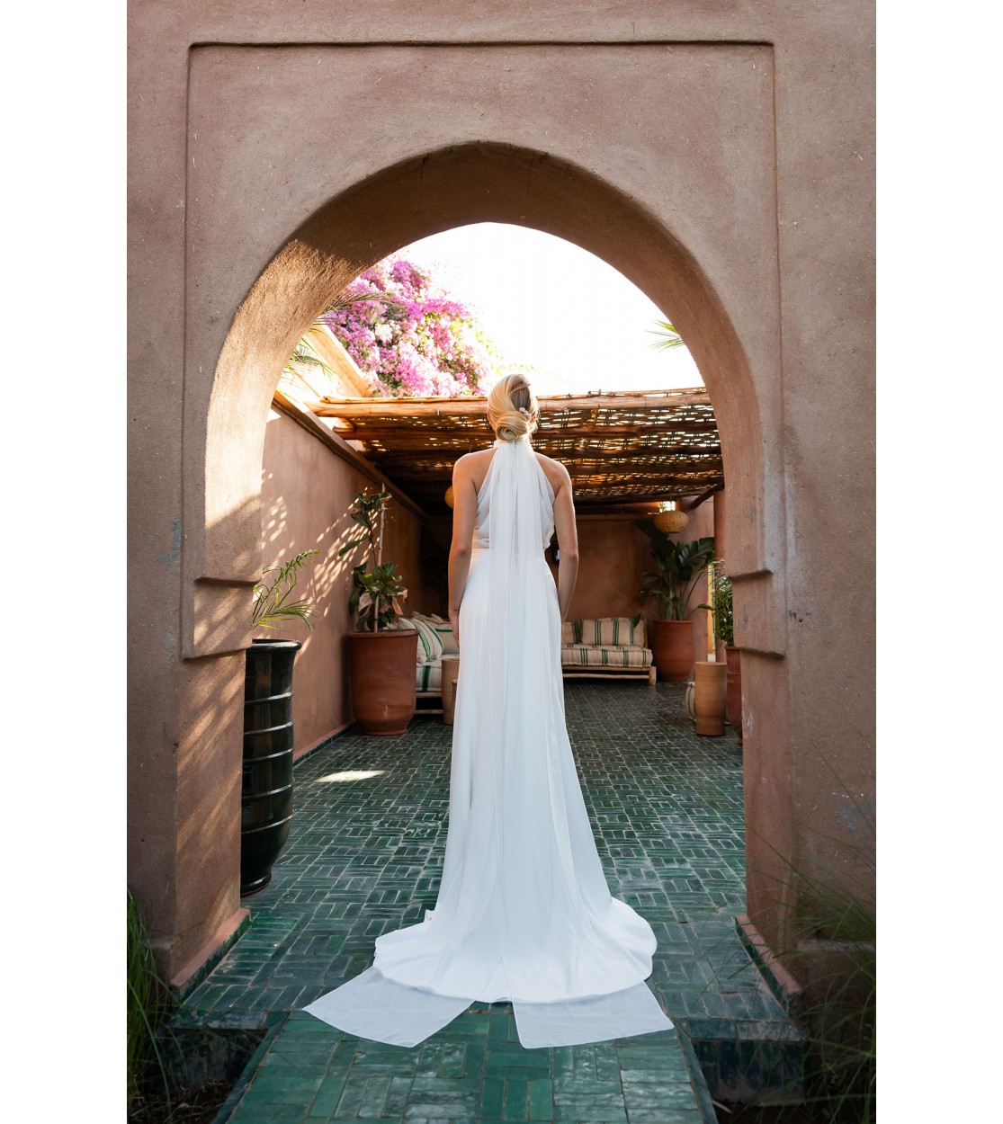 Les deux pans en mousseline sont de subtils accessoires imaginés pour sublimer la silhouette avec légèreté et raffinement.D’une longueur de 2m20 pour 35 cm de largeur, ils se fixent aisément grâce à des boutons-pressions discrets, fournis pour tout achat en ligne.Conçus pour s’adapter parfaitement aux modèles Victoria, Meghan et Maya, ces pans froncés créent un effet traîne vaporeux qui accompagne le mouvement et se déploie gracieusement au vent.Un détail élégant et poétique, signature du savoir-faire de la Maison Harpe.