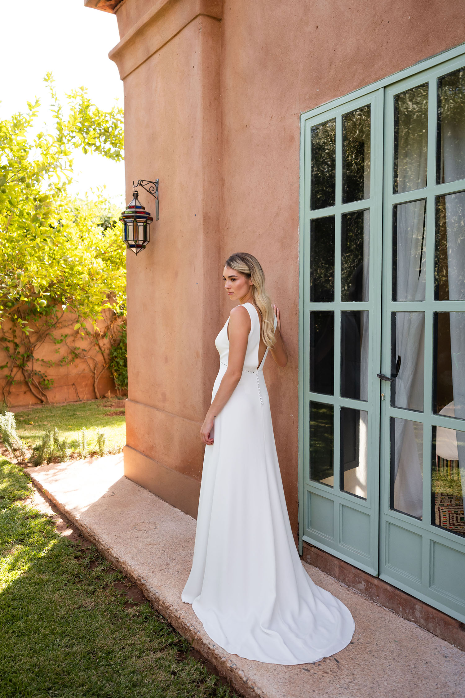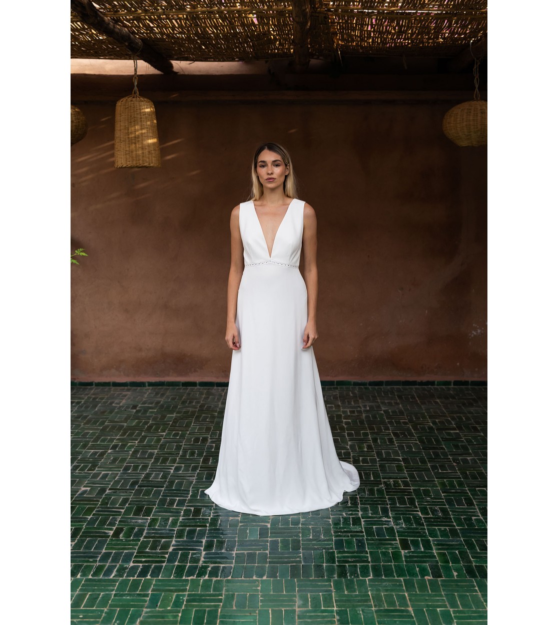 Épurée et sophistiquée, cette robe incarne l’élégance moderne dans sa plus belle simplicité. Réalisée entièrement en crêpe de soie ou en crêpe de satin, elle séduit par son tombé fluide et sa ligne élancée.