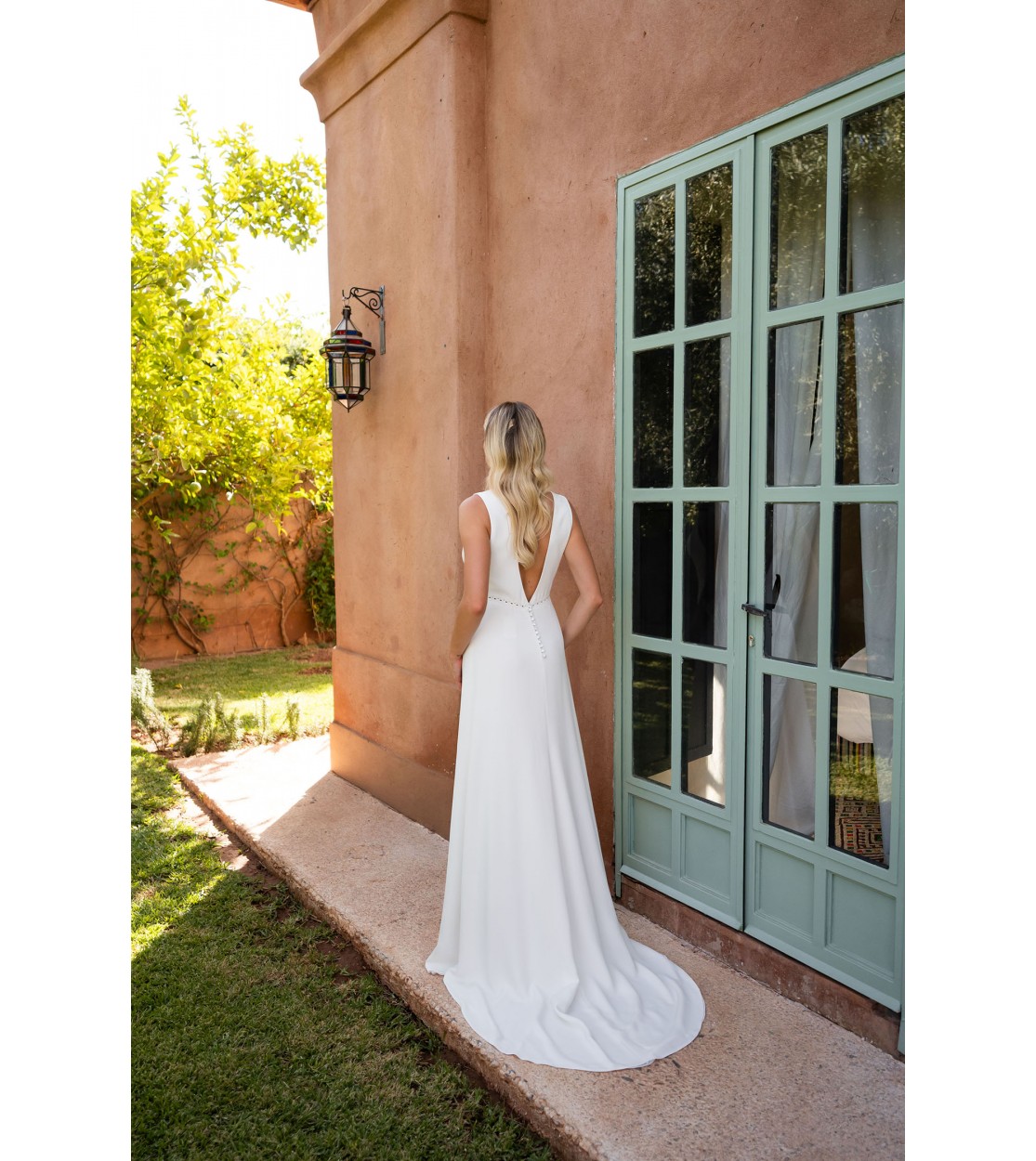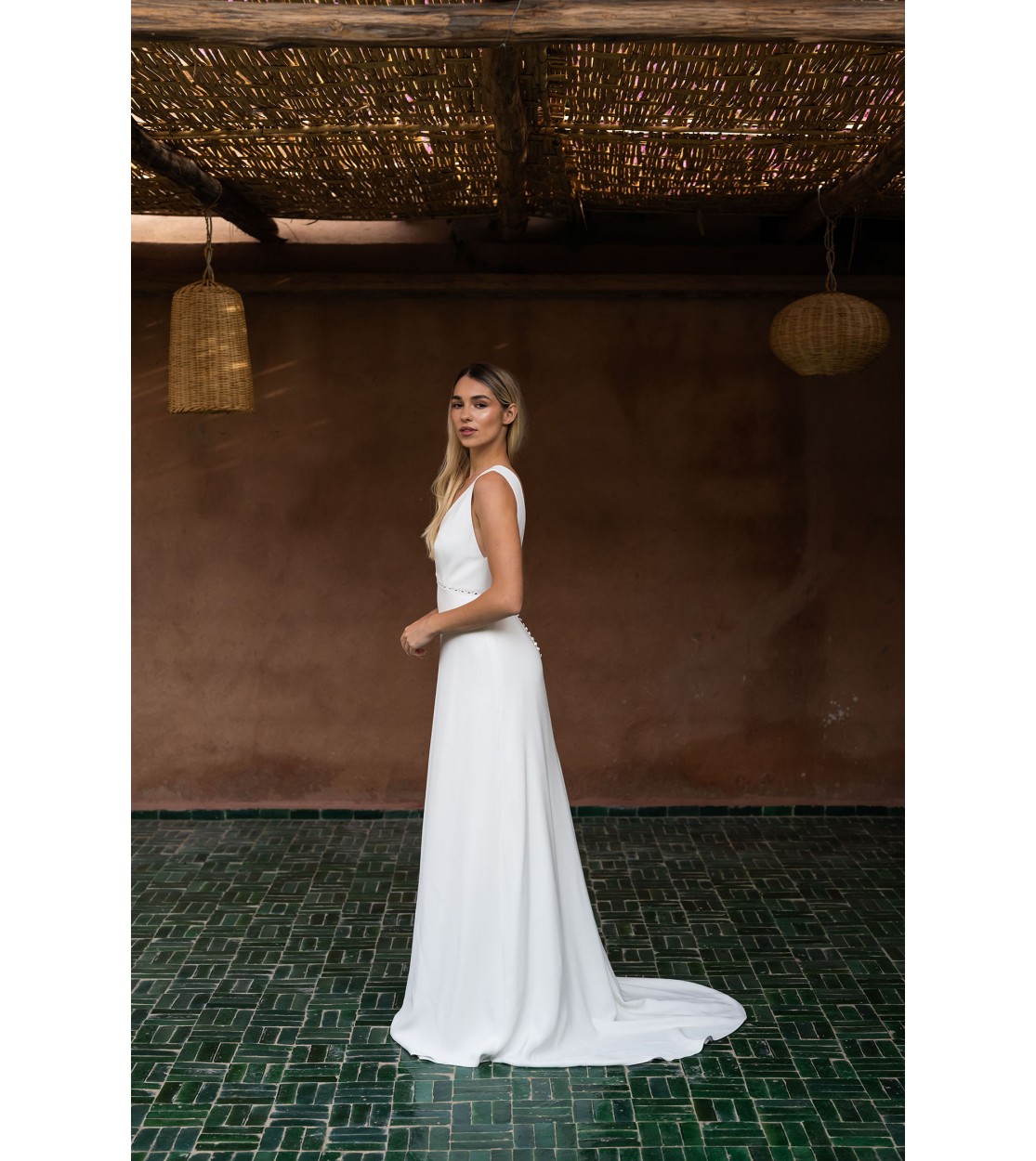 Son décolleté profond souligne avec subtilité la féminité, tandis que le dos nu captivant se pare d’une délicate tresse ajourée, apportant une touche à la fois sensuelle et raffinée. La jupe colonne, prolongée d’une petite traîne, allonge la silhouette et offre une allure chic et intemporelle.