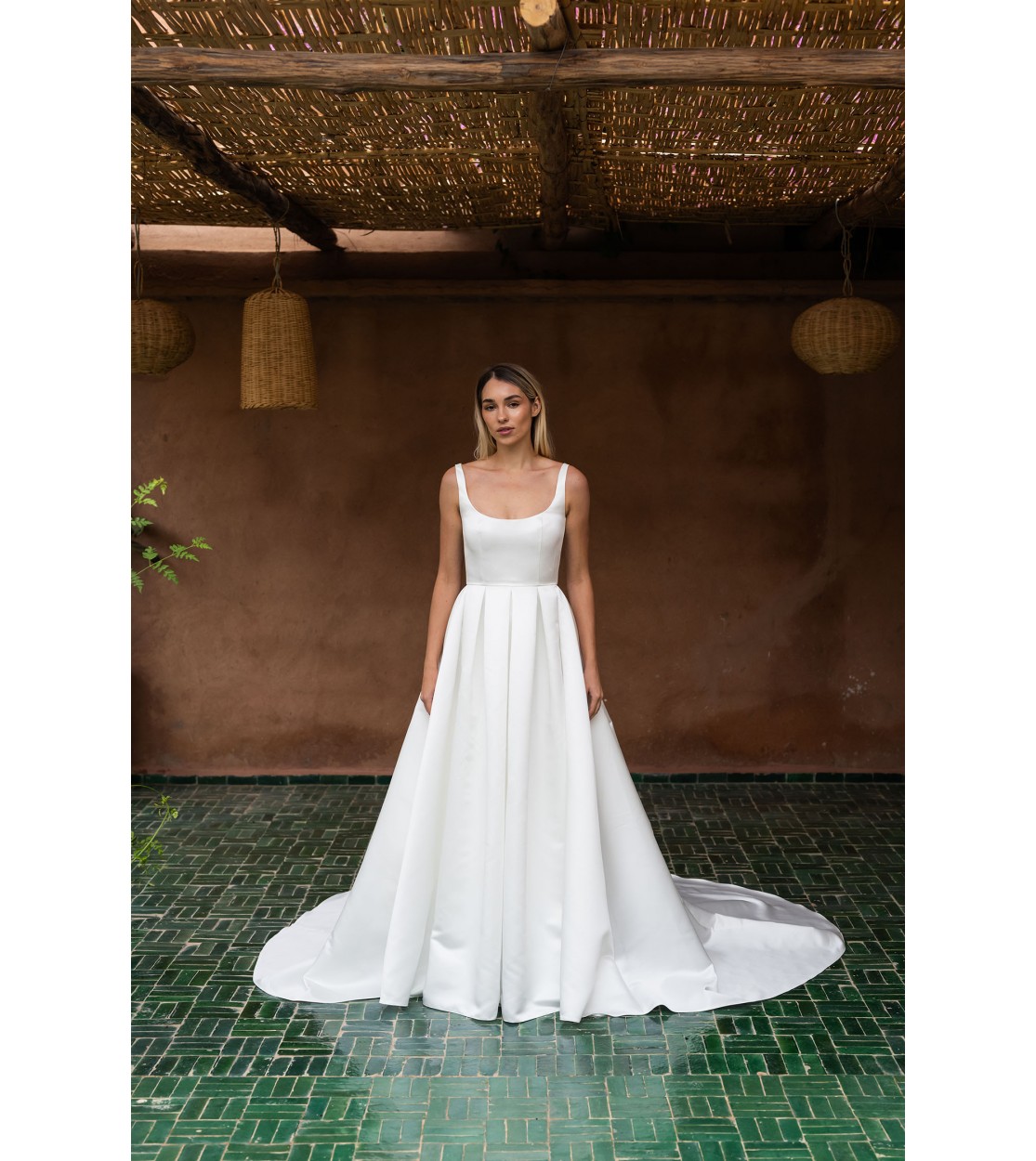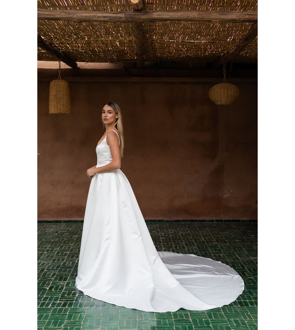 Une robe à l’esprit intemporel : moderne par sa coupe épurée et ses détails actuels, classique par son volume somptueux et son allure royale.