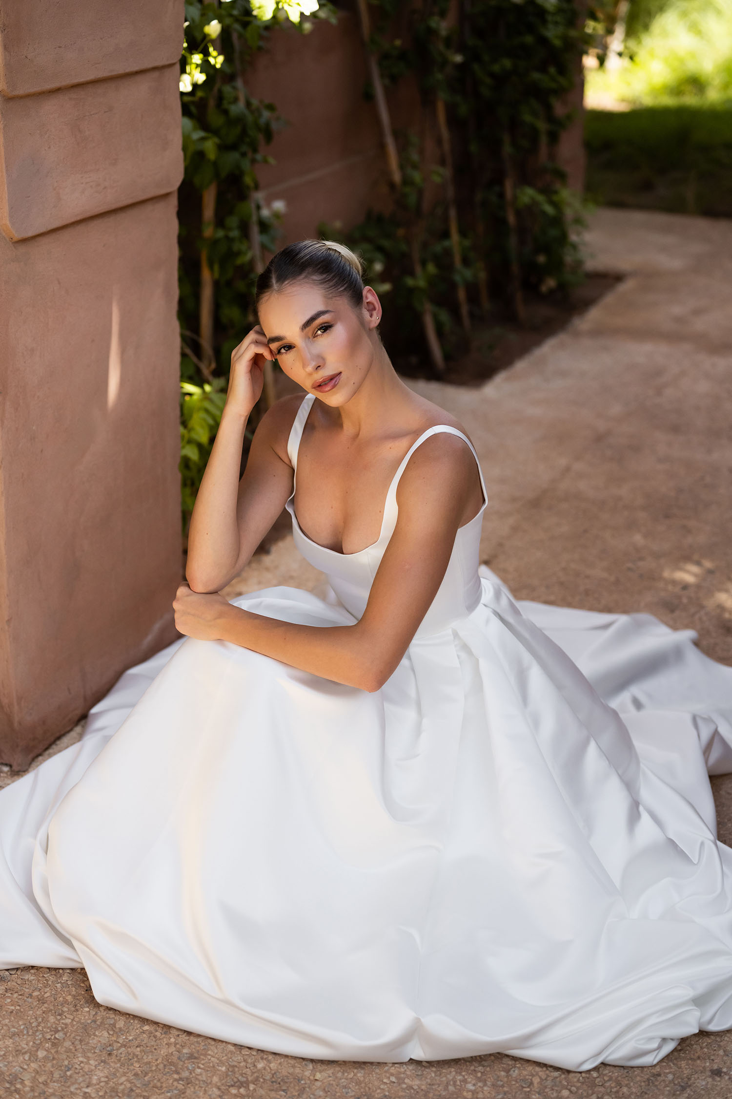 Cette création majestueuse séduit par son volume princier et son éclat raffiné. Réalisée en satin duchesse, elle incarne le mariage parfait entre modernité et classicisme.