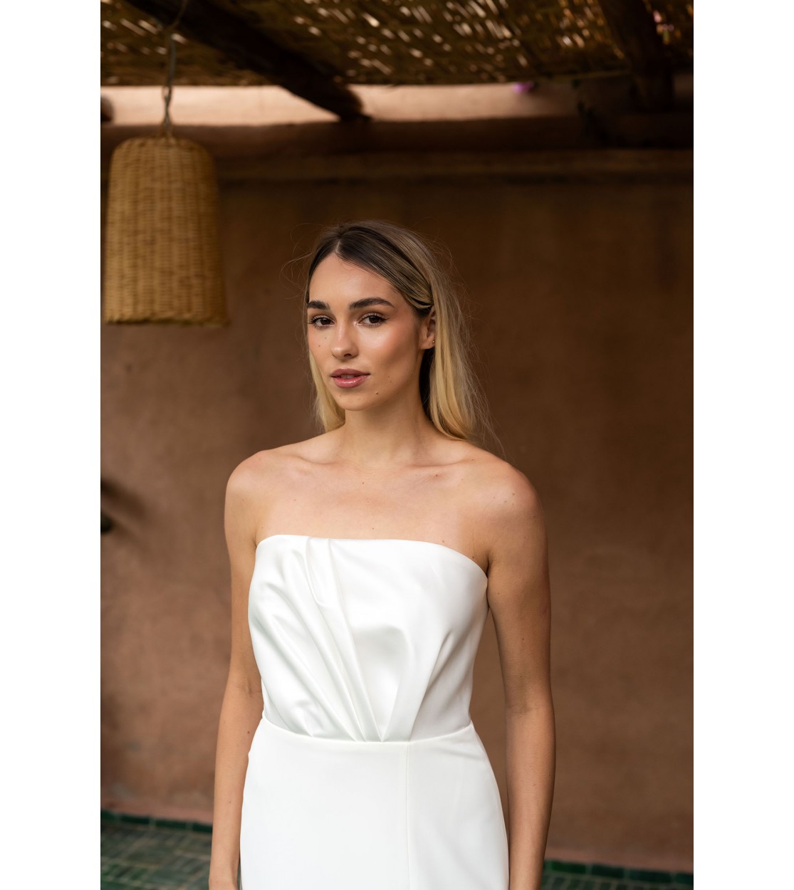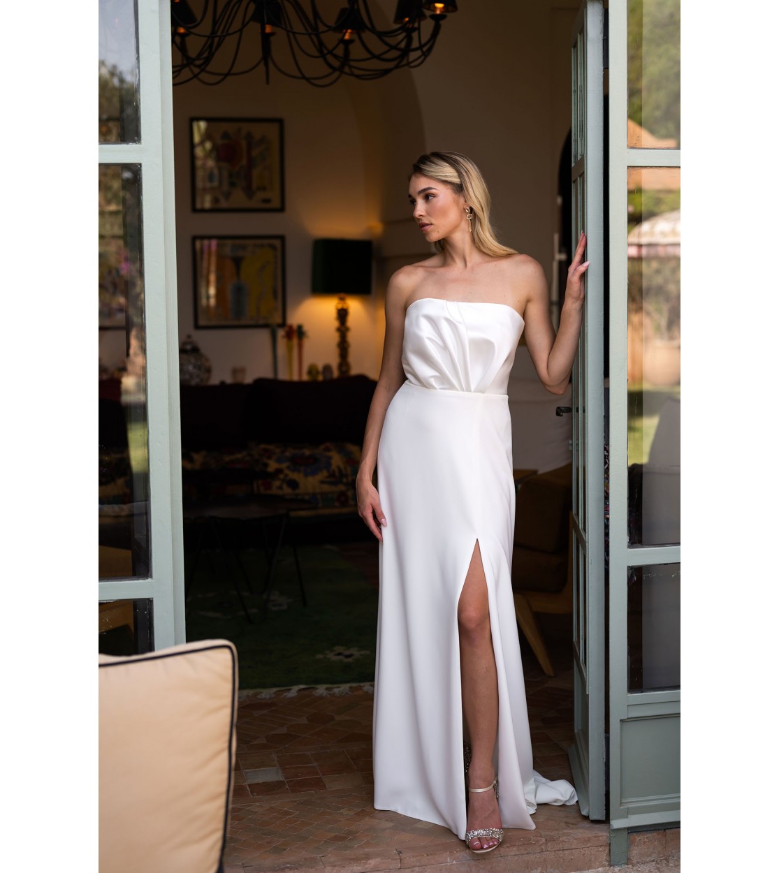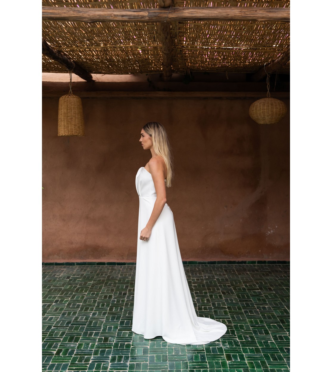 La jupe, en crêpe, épouse les courbes avec justesse et s’ouvre sur une fente subtile avant de s’achever par une légère traîne. Derrière sa simplicité apparente, Noémie révèle un savoir-faire couture exceptionnel et une sophistication intemporelle.