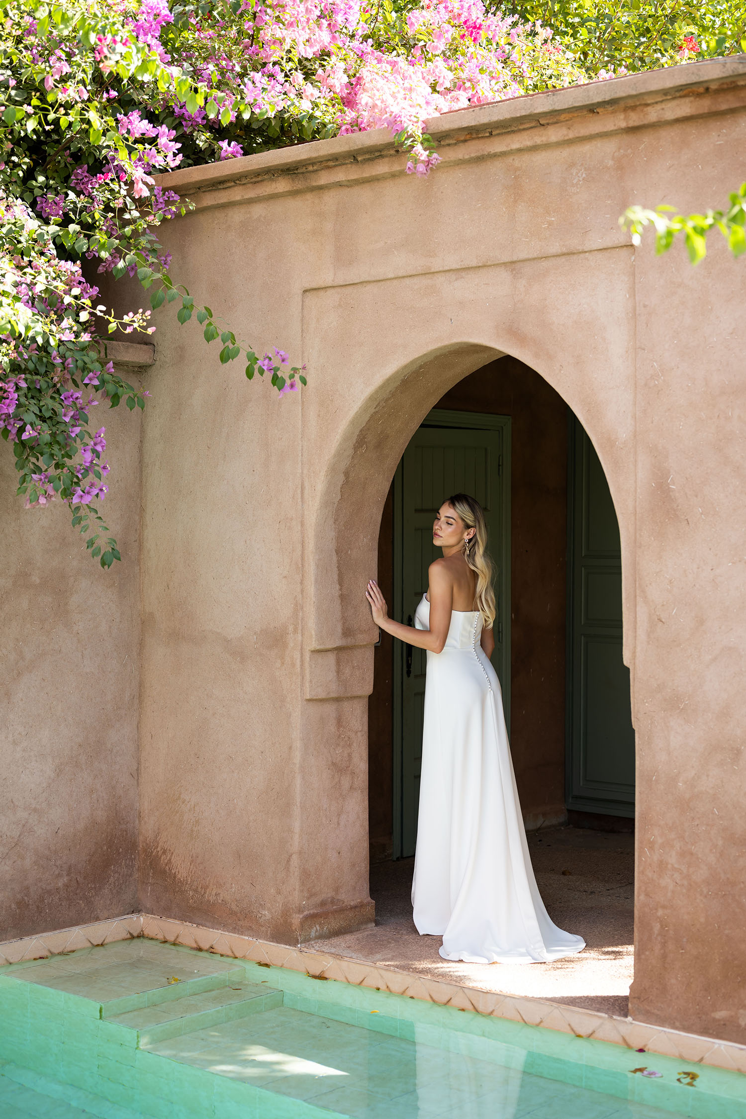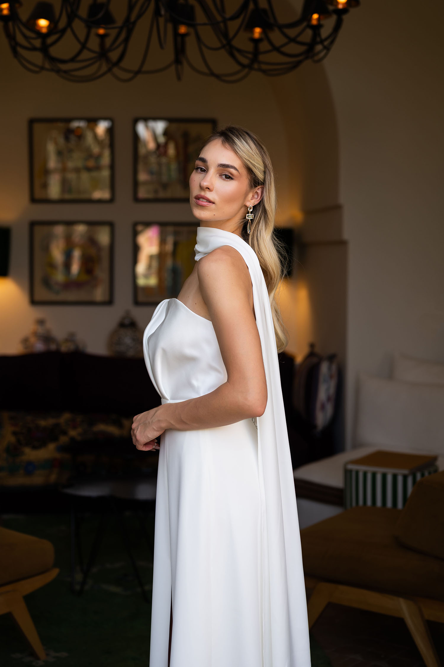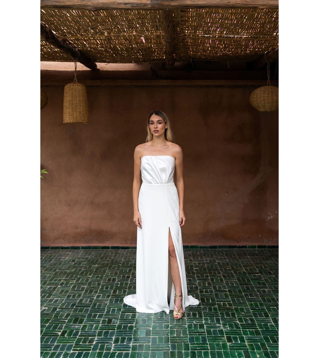 La jupe, en crêpe, épouse les courbes avec justesse et s’ouvre sur une fente subtile avant de s’achever par une légère traîne. Derrière sa simplicité apparente, Noémie révèle un savoir-faire couture exceptionnel et une sophistication intemporelle.