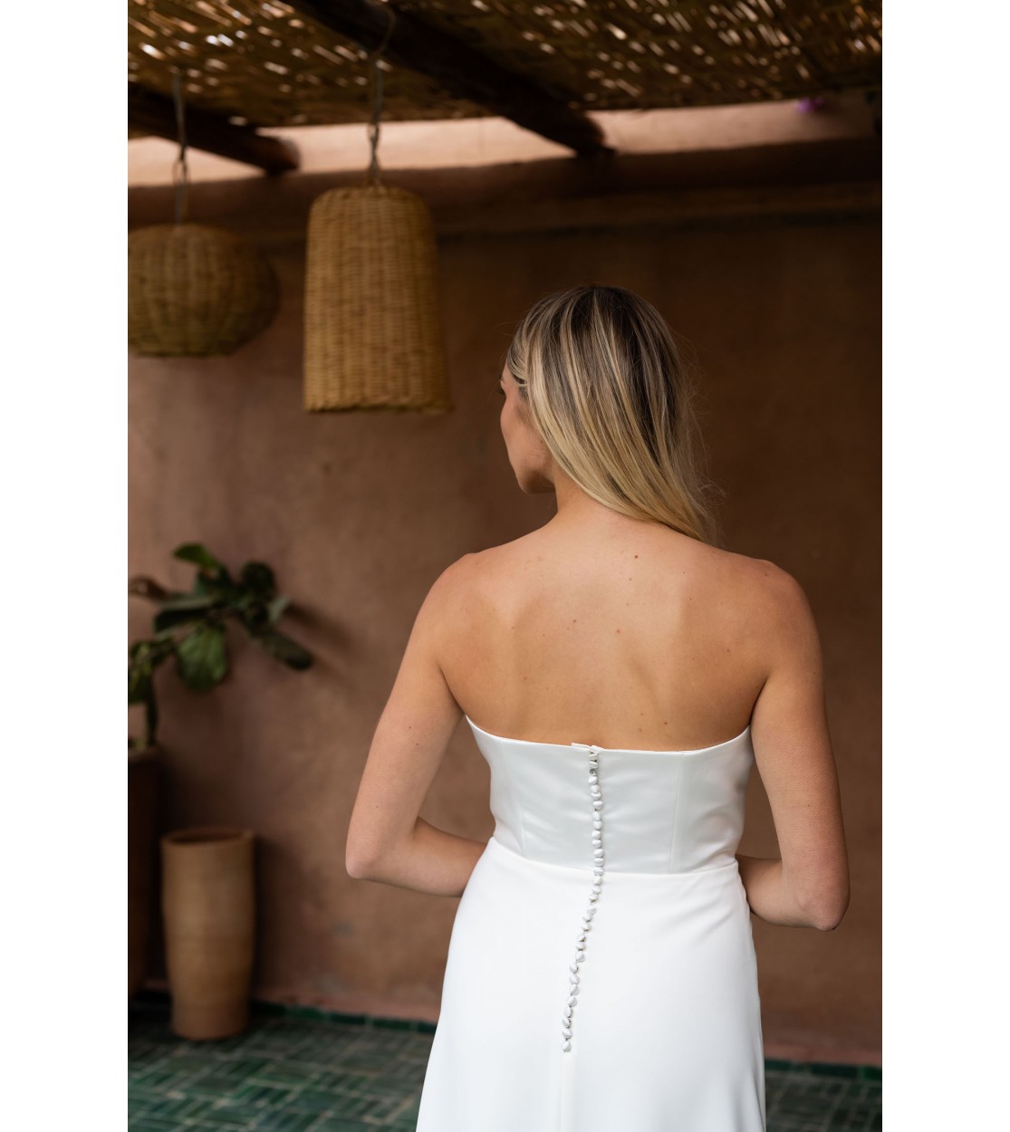Son bustier, véritable pièce maîtresse, est délicatement travaillé de multiples plis qui soulignent le corsage et dessinent une ligne féminine et assurée. Dans le dos, une rangée infinie de petits boutons recouverts vient prolonger cette élégance jusque dans les moindres détails.