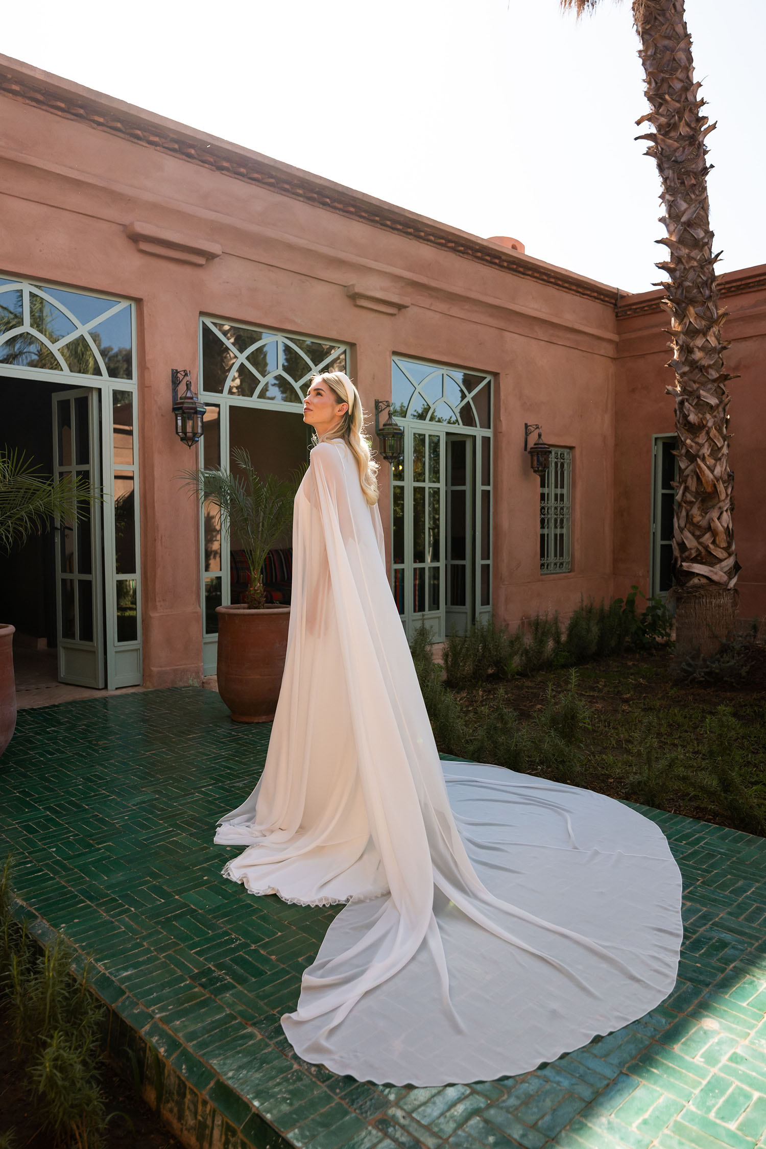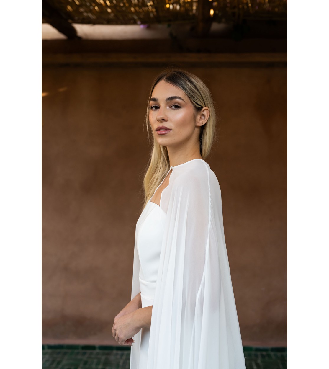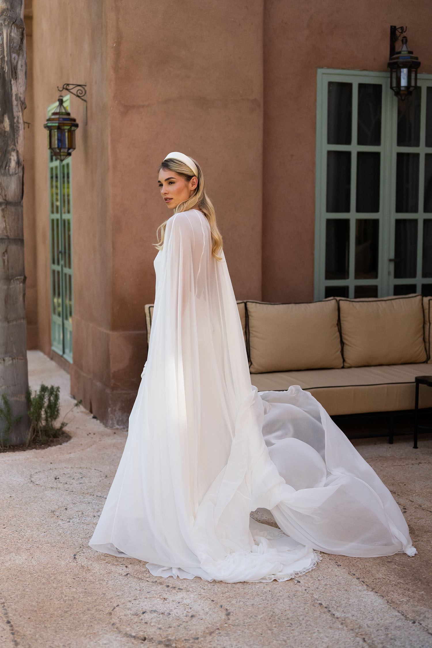 La cape traîne en mousseline séduit par son ampleur majestueuse et son encolure arrondie au tombé délicat. Légère et aérienne, elle se marie harmonieusement avec les robes de mariée en crêpe ou monomatière, qu’elles soient bustier ou à fines bretelles, apportant une touche couture qui sublime la silhouette avec élégance. Véritable pièce d’exception, elle se retire aisément au moment du cocktail, révélant une seconde allure tout aussi gracieuse et surprenante.