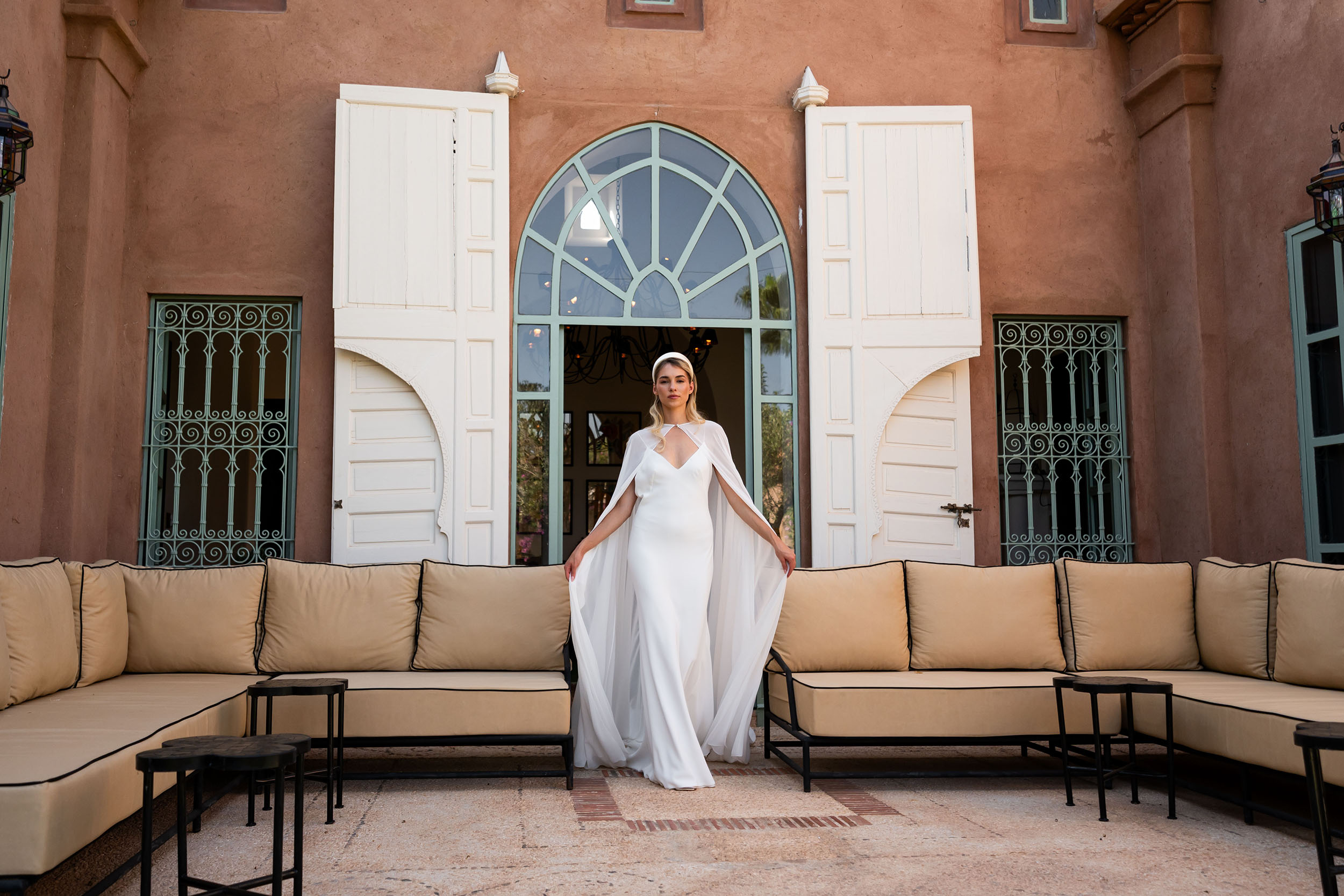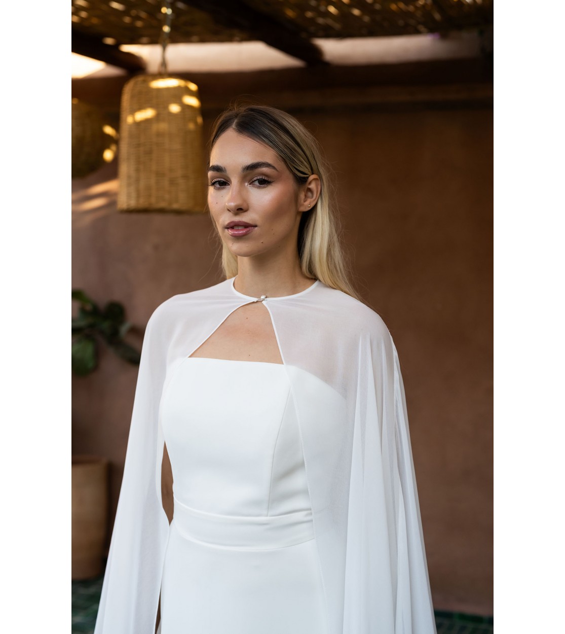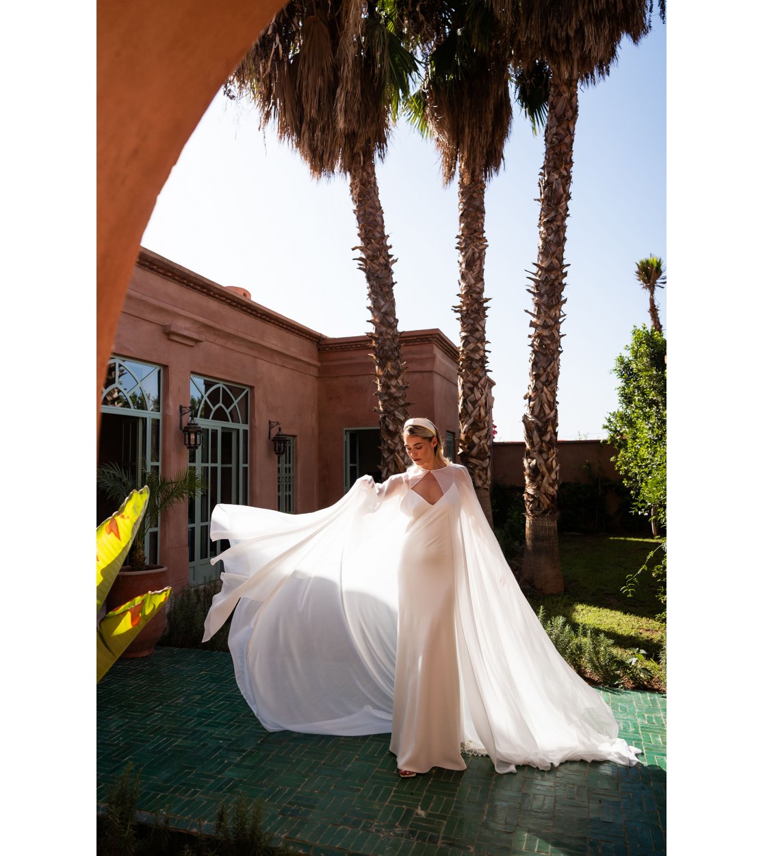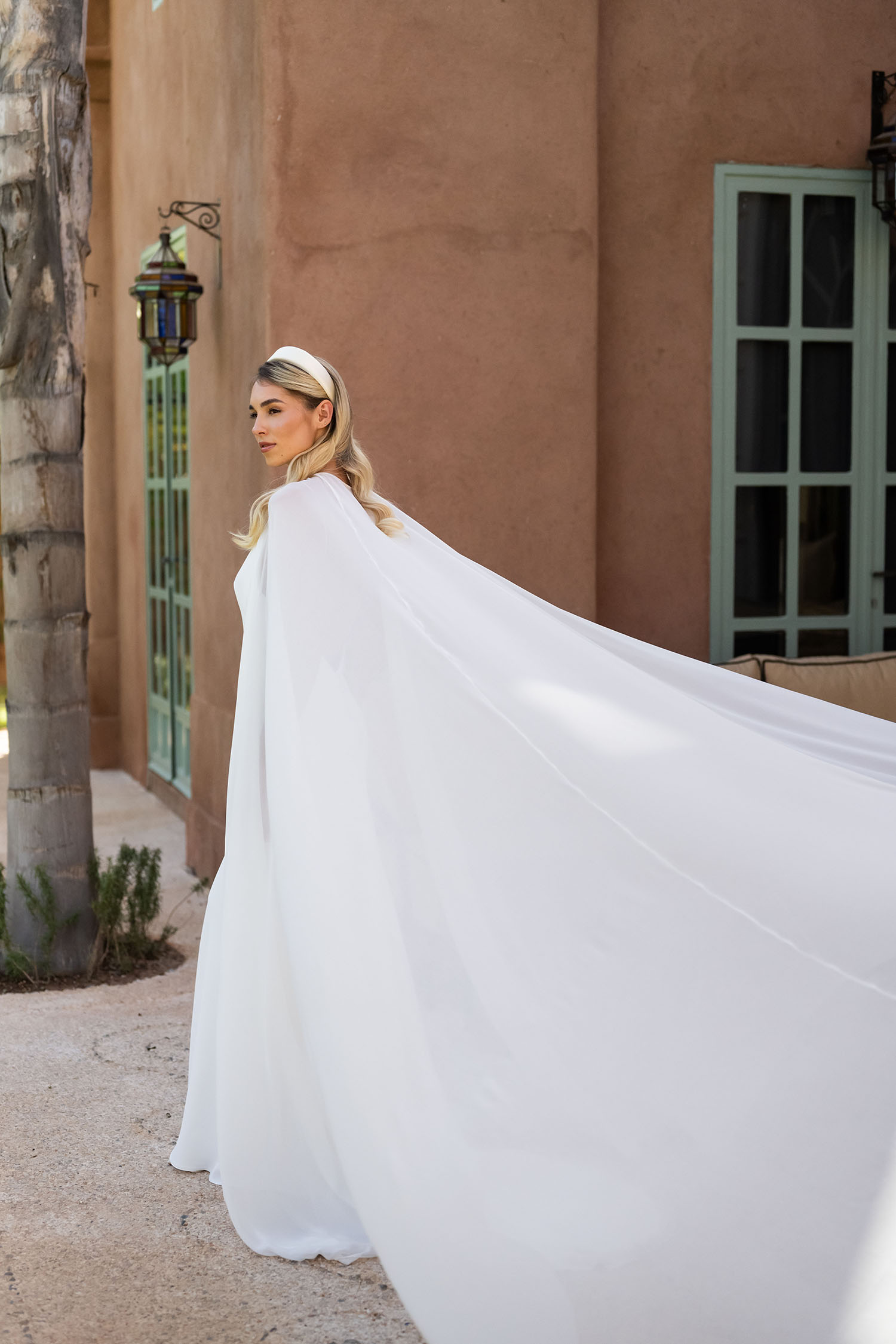 La cape traîne en mousseline séduit par son ampleur majestueuse et son encolure arrondie au tombé délicat. Légère et aérienne, elle se marie harmonieusement avec les robes de mariée en crêpe ou monomatière, qu’elles soient bustier ou à fines bretelles, apportant une touche couture qui sublime la silhouette avec élégance. Véritable pièce d’exception, elle se retire aisément au moment du cocktail, révélant une seconde allure tout aussi gracieuse et surprenante.