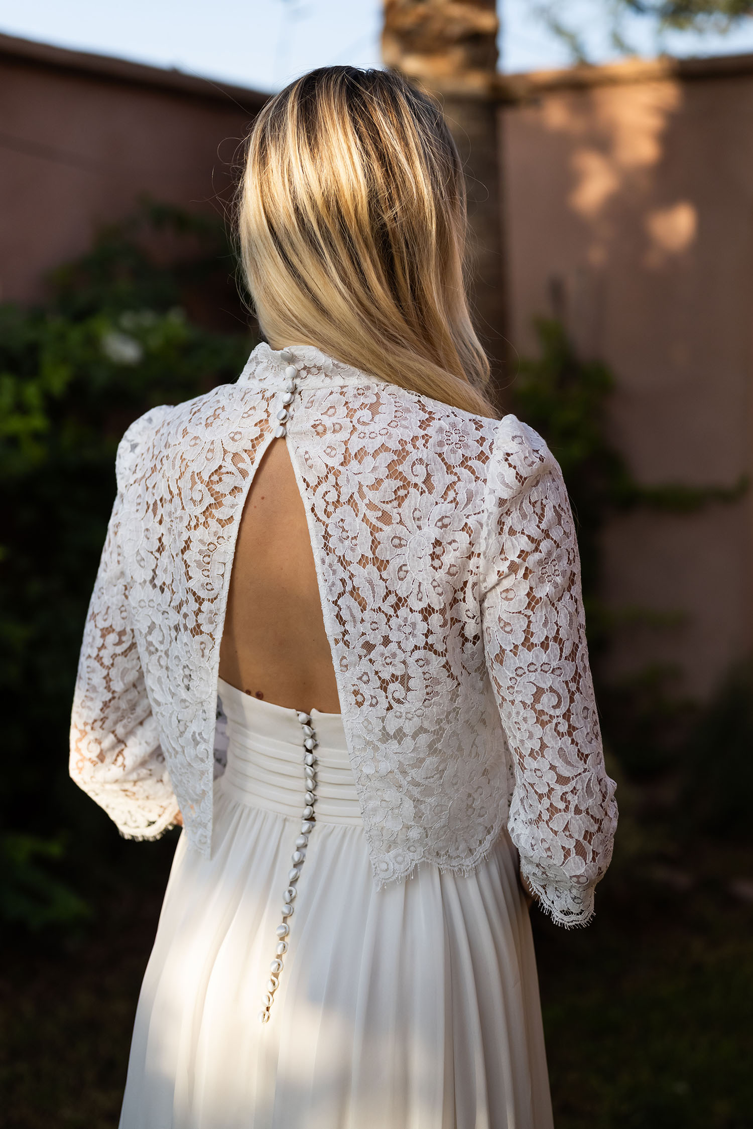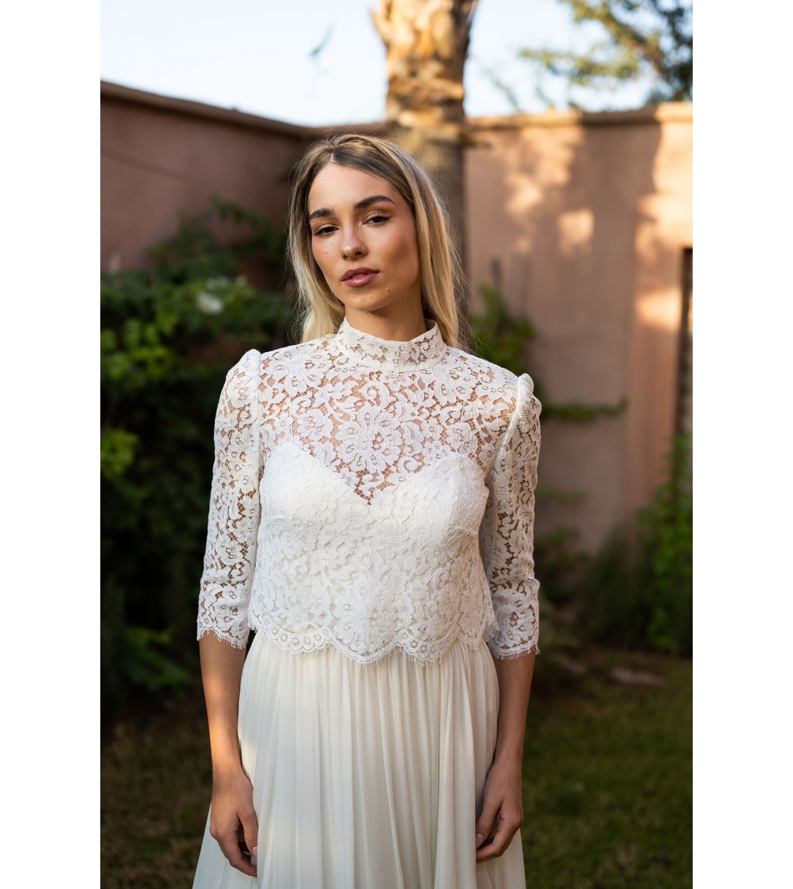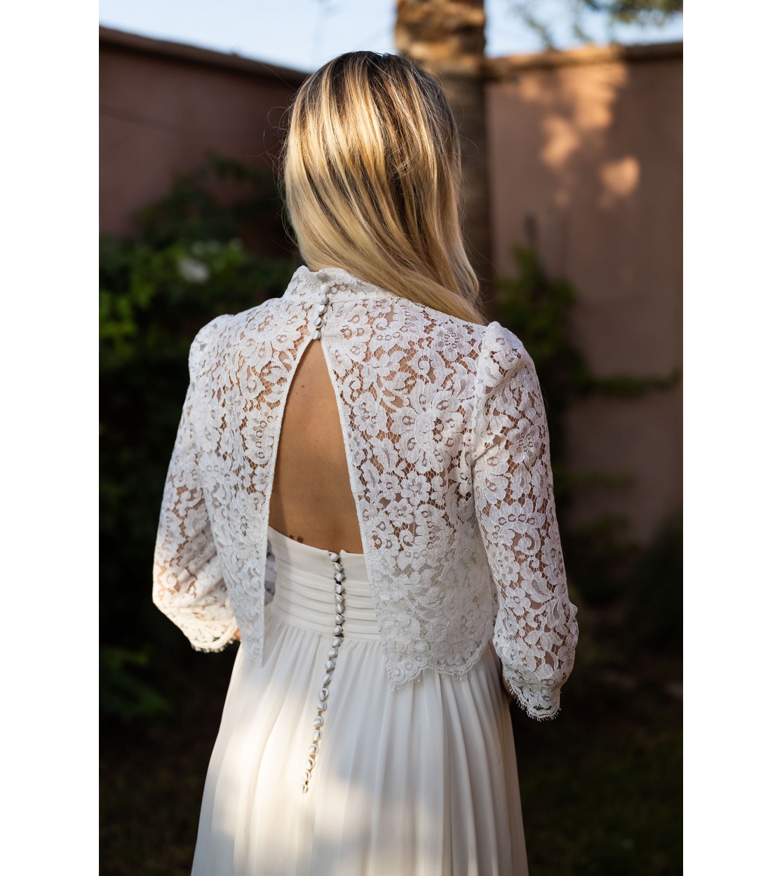 Haut de mariée en dentelle de Calais au col victorien, idéal pour sublimer une robe de mariée sans manches. Ses manches ¾ et son col montant lui confèrent une allure élégante et raffinée. Orné de délicats motifs floraux en dentelle de Calais, il se ferme dans le dos par de petits boutons recouverts. Son large dos nu fendu dévoile subtilement la silhouette, tout en jouant sur la transparence grâce à son motif ajouré.