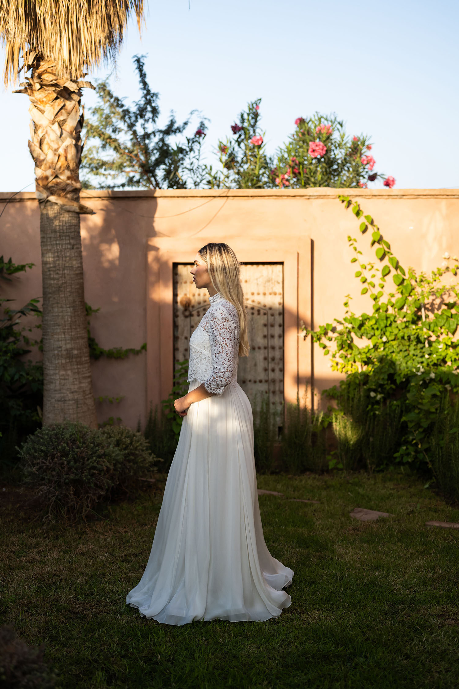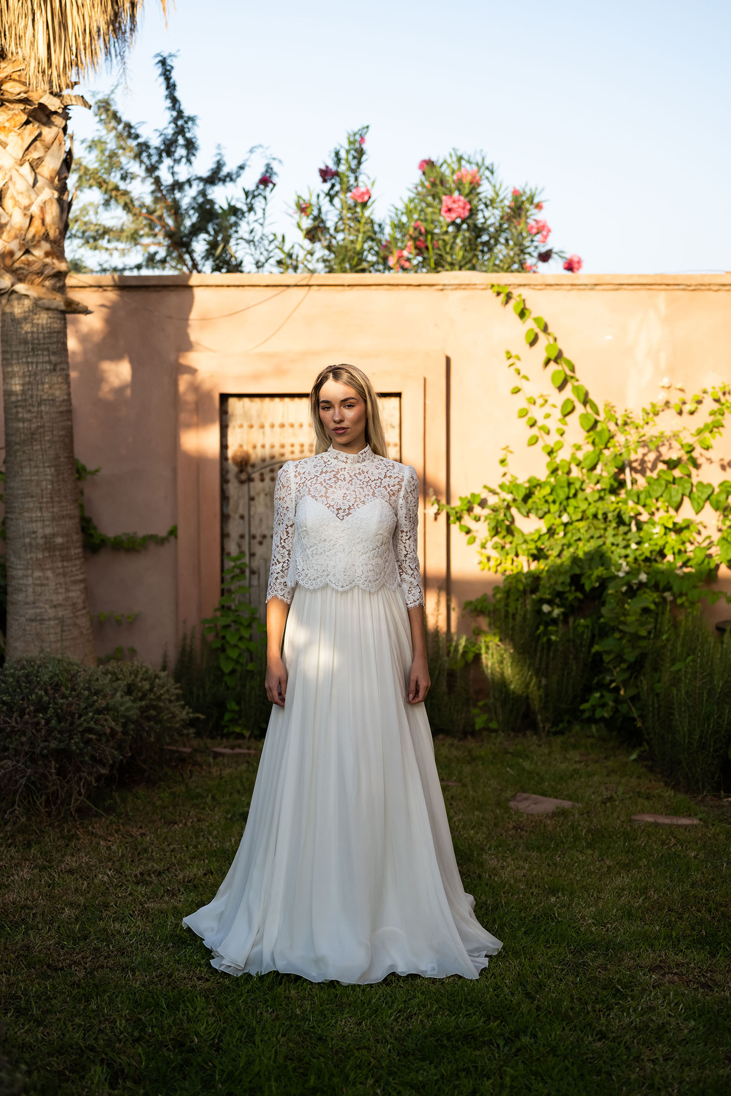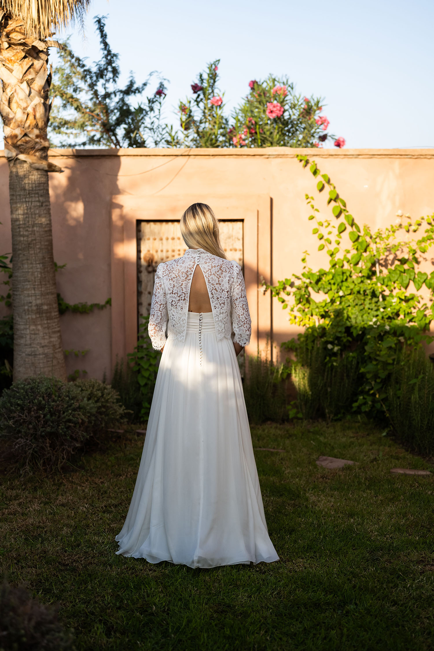 Haut de mariée en dentelle de Calais au col victorien, idéal pour sublimer une robe de mariée sans manches. Ses manches ¾ et son col montant lui confèrent une allure élégante et raffinée. Orné de délicats motifs floraux en dentelle de Calais, il se ferme dans le dos par de petits boutons recouverts. Son large dos nu fendu dévoile subtilement la silhouette, tout en jouant sur la transparence grâce à son motif ajouré.